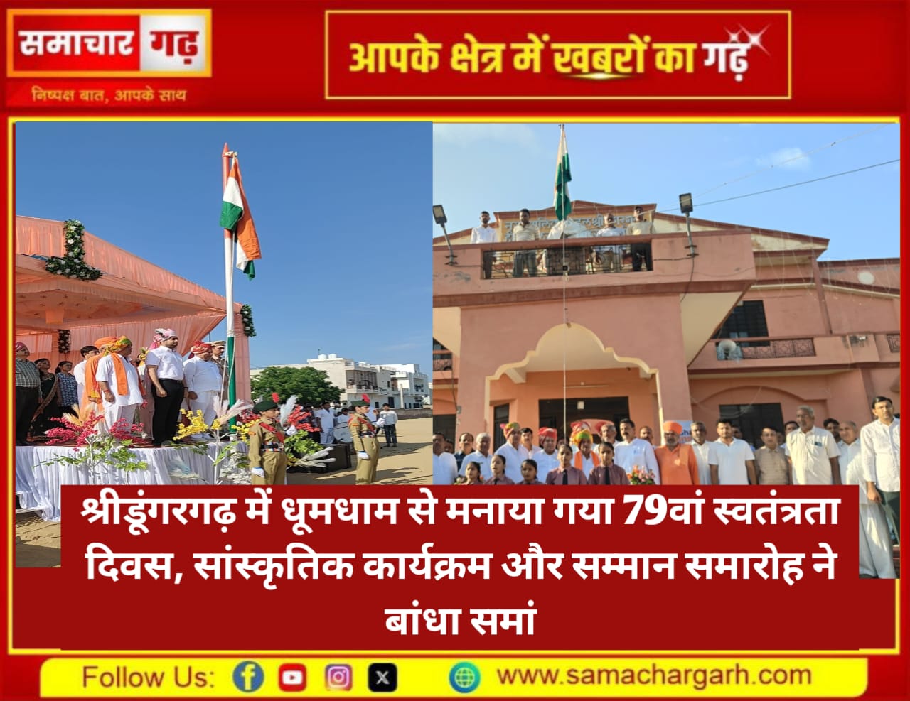 79वें स्वतंत्रता दिवस के अवसर पर श्रीडूंगरगढ़ में उपखंड स्तरीय एवं नगरपालिका स्तर पर भव्य समारोह का आयोजन हुआ। राजकीय रूपा देवी मोहता उच्च माध्यमिक विद्यालय खेल मैदान में आयोजित उपखंड स्तरीय मुख्य समारोह में मुख्य अतिथि विधायक ताराचंद सारस्वत ने ध्वजारोहण कर राष्ट्रगान के साथ कार्यक्रम की शुरुआत की। वहीं नगरपालिका परिसर में भी विधायक सारस्वत ने ध्वजारोहण कर समारोह का शुभारंभ किया।