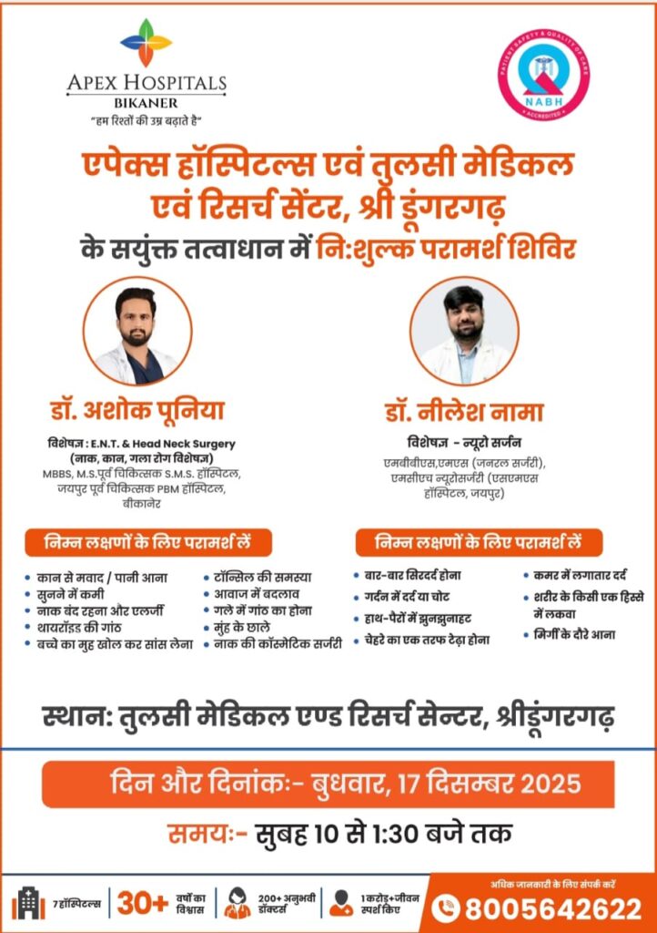 समाचार गढ़, श्रीडूंगरगढ़। तुलसी मेडिकल एण्ड रिसर्च सेण्टर अस्पताल, श्रीडूँगरगढ़ में कल 17 दिसम्बर 2025, बुधवार को निःशुल्क नाक, कान, गला एवं न्यूरो सर्जरी परामर्श शिविर का आयोजन किया जाएगा। इस शिविर में एपेक्स हॉस्पिटल, बीकानेर के डॉ. अशोक पूनिया (कान, नाक व गला रोग विशेषज्ञ) तथा डॉ. नीलेश नामा (न्यूरो सर्जन) अपनी सेवाएं देंगे। शिविर में ईएनटी से संबंधित रोग जैसे कान में मवाद आना, सुनने में कमी, नाक बंद रहना, एलर्जी, थायरॉयड की गांठ, टॉन्सिल की समस्या, आवाज में बदलाव, गले में गांठ सहित न्यूरो से जुड़ी समस्याएं जैसे बार-बार सिर दर्द, कमर व गर्दन में लगातार दर्द, हाथ-पैरों में झुनझुनाहट, मिर्गी के दौरे, चेहरे का एक तरफ टेढ़ा होना, लकवा आदि रोगों की जांच व परामर्श दिया जाएगा। अस्पताल प्रशासक सूर्यप्रकाश गांधी ने बताया कि शिविर का समय प्रातः 10:00 बजे से दोपहर 01:30 बजे तक रहेगा, जबकि पंजीकरण प्रातः 09:00 बजे से प्रारम्भ होगा। साथ ही उन्होंने बताया कि डॉ. अशोक पूनिया (ईएनटी), डॉ. नीलेश नामा (न्यूरो सर्जन) एवं डॉ. चंचल गुप्ता (नेत्र रोग विशेषज्ञ) की सेवाएं नियमित रूप से प्रत्येक बुधवार को उपलब्ध रहती हैं।