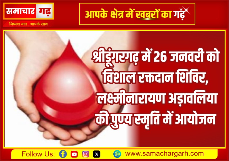 श्रीडूंगरगढ़ में 26 जनवरी को विशाल रक्तदान शिविर, स्व. लक्ष्मीनारायण अड़ावलिया की पुण्य स्मृति में आयोजन