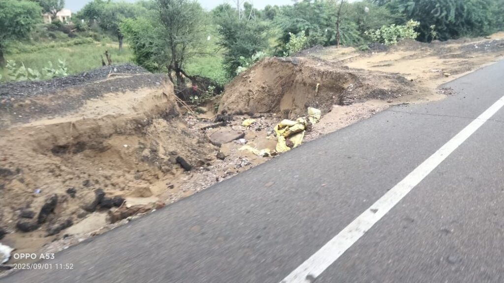 समाचार गढ़ 1 सितंबर 2025 श्रीडूंगरगढ़। रविवार को हुई भारी बरसात ने श्रीडूंगरगढ़ अंचल में हालात बिगाड़ दिए। कई मकान ढह गए, तो कई घरों में पानी भरने से ढहने का खतरा बना हुआ है। वहीं बीकानेर-जयपुर राष्ट्रीय राजमार्ग संख्या 11 पर जगह-जगह बने गहरे कटाव अब हादसों को खुला न्यौता दे रहे हैं।