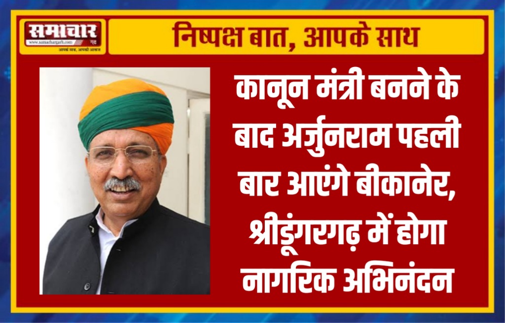 समाचार-गढ़, 26 मई 2023। केंद्रीय संस्कृति व संसदीय कार्य मंत्री बीकानेर सांसद अर्जुनराम मेघवाल को कानून, न्याय मंत्रालय की जिम्मेदारी मिलने के बाद पहली बार 29 मई को सड़क मार्ग से बीकानेर आयेंगे। बीकानेर आगमन पर मेघवाल का जगह-जगह स्वागत समारोह रखा जाएगा। सुबह 10 बजे श्रीडूंगरगढ़ में भाजपा कार्यकर्ताओं द्वारा घुमचक्कर पर स्वागत किया जाएगा। जिसके बाद खुली जीप में जुलूस के साथ बैंड बाजे, ढोल नगाड़ों के साथ तेरापंथ भवन धोलिया नोहरा पहुंचेगे। वहां उनका नागरिक अभिनंदन किया जाएगा। बीकानेर में सांय 4 बजे से राज मंदिर भवन में भाजपा कोषाध्यक्ष शिवरतन अग्रवाल द्वारा अर्जुनराम मेघवाल का नागरिक अभिनंदन व स्नेह भोज का आयोजन रखा जाएगा जिसमे सामाजिक, व्यापारिक संस्थाओं, पार्टी पदाधिकारियों, कार्यकर्ताओं, आमजन द्वारा नवनियुक्त मंत्री मेघवाल का सम्मान किया जाएगा।