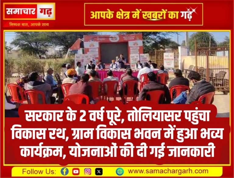 समाचार गढ़, श्रीडूंगरगढ़। राज्य सरकार के दो वर्ष पूर्ण होने के उपलक्ष्य में संचालित विकास रथ अभियान के तहत बुधवार को तोलियासर ग्राम पंचायत में कार्यक्रम आयोजित किया गया। कार्यक्रम ग्राम विकास भवन में आयोजित हुआ, जहां ग्रामीणों को सरकार की जनकल्याणकारी योजनाओं की जानकारी दी गई।