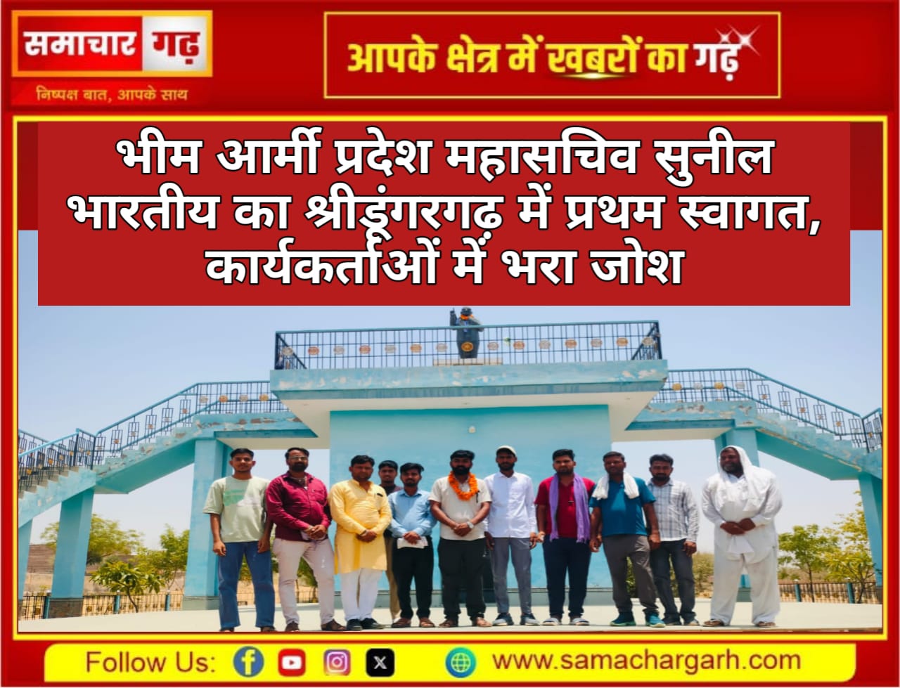 समाचार गढ़, श्रीडूंगरगढ़, 24 मई 2025 राजस्थान में भीम आर्मी के प्रदेश महासचिव और आजाद समाज पार्टी बीकानेर संभाग प्रभारी सुनील भारतीय के प्रथम श्रीडूंगरगढ़ आगमन पर भीम आर्मी कार्यकर्ताओं ने सरदारशहर रोड स्थित डॉ. भीमराव अंबेडकर स्मृति भवन में उनका गर्मजोशी से स्वागत किया।