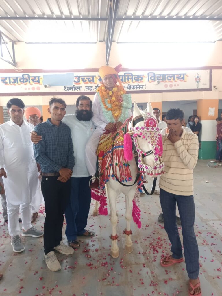 समाचार-गढ़, 31 मई 2023। राजकीय उच्च माध्यमिक विद्यालय धर्मास से भोम नाथ सिद्ध अपनी 32 वर्ष की राजकीय सेवा पूर्ण कर आज वरिष्ठ अध्यापक पद से सेवानिवृत हुए। विद्यालय के स्टाफ साथियों द्वारा आज विदाई और सम्मान समारोह रखा गया। सिद्ध को घोड़ी पर चढ़ा कर विदा किया गया। प्राचार्य अरविंद कुमार ने बताया कि सिद्ध का कार्यकाल बहुत ही सराहनीय और विधार्थियो के प्रति समर्पित रहा। इस अवसर पर भोम नाथ सिद्ध ने विद्यालय में बड़ा बक्शा और इलेक्ट्रिक घंटी भेंट करने की घोषणा की। कार्यक्रम में मंच संचालन लक्ष्मीनारायण भादू और शारदा चौधरी द्वारा किया गया। शंकर सिद्ध ने बताया की सिद्ध अपनी सेवा के प्रति बहुत ही समर्पित थे। किशनलाल और रामकृष्ण द्वारा श्री फल व प्रशस्ति पत्र देकर समानित किया गया। विदाई कार्यक्रम में नोरंग राम(प्राचार्य बाना), कुशला राम, हरिराम सऊ भंवर लाल बाना, मदनलाल, SMC अध्यक्ष मानाराम मेघवाल, रामनिवास पुनिया, चेतन राम, नोरंग राम, श्रवनराम, भगवाना राम, मोटाराम, मनोज, दुर्ग नाथ गिरदावर, रामलाल नाथ, भागीरथ सिंह और ग्रामीण जन उपस्थित रहे। कार्यक्रम प्रभारी संजय चौधरी ने सभी का आभार प्रकट किया।