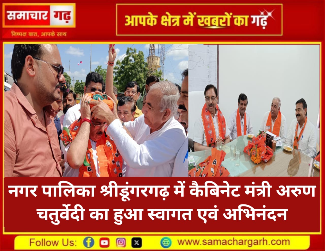 राजस्थान सरकार में कैबिनेट मंत्री एवं वित्त आयोग के अध्यक्ष अरुण चतुर्वेदी का जयपुर से बीकानेर प्रवास के दौरान सोमवार को श्रीडूंगरगढ़ नगर पालिका में स्वागत एवं अभिनंदन किया गया।