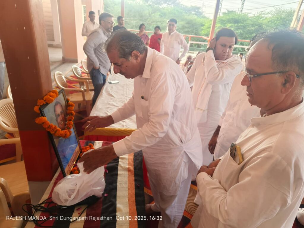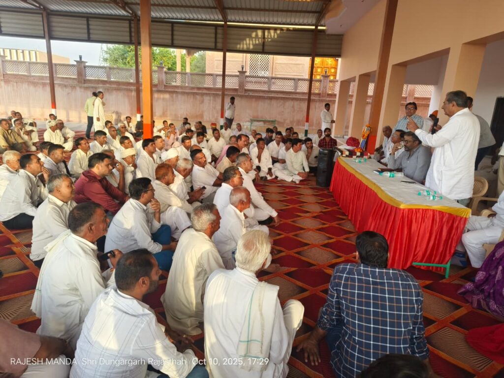 समाचार गढ़, श्रीडूंगरगढ़, 11 अक्टूबर 2025। ब्लॉक कांग्रेस कमेटी श्रीडूंगरगढ़ व सूडसर तथा नगर कांग्रेस कमेटी श्रीडूंगरगढ़ द्वारा शुक्रवार को वीर तेजाजी मंदिर प्रांगण में संगठन सृजन अभियान के तहत एक महत्वपूर्ण बैठक का आयोजन किया गया। बैठक की अध्यक्षता पूर्व विधायक मंगलाराम गोदारा ने की, जबकि बीकानेर जिले के पर्यवेक्षक एवं एआईसीसी सचिव राजेश लिलोटिया ने बैठक का संचालन करते हुए आगामी संगठनात्मक गतिविधियों पर दिशा-निर्देश दिए। बैठक में बूथ स्तर तक संगठन को मज़बूत करने, कार्यकर्ताओं को सक्रिय भूमिका में लाने तथा अभियान को गति देने पर विस्तार से चर्चा हुई। इस अवसर पर जिला अध्यक्ष बिशनाराम सियाग, प्रधान प्रतिनिधि केसराराम गोदारा, ब्लॉक अध्यक्ष श्रीराम भादू, शहर अध्यक्ष ओमप्रकाश गुरावा, नगरपालिका नेता प्रतिपक्ष अंजू पारख, वरिष्ठ नेता मदनगोपाल मेघवाल, प्रभुराम बाना, कन्हैयालाल सोमानी, राधेश्याम सारस्वत, सहीराम गोदारा, विमल भाटी, मूलाराम भादू, कोडाराम भादू, संदीप मारू, पूनमचंद नैन, रमेश प्रजापत, सोहनलाल नैन, हरिराम बाना, हेतराम जाखड़, सत्यनारायण जाट, हीरालाल जाट, मूलचंद स्वामी, दीपक गौतम, आशीष सेवग, अशोक बुढ़िया, विजयराज सेवग, भागूराम सहू, गोरधन खिलेरी, राधाकिशन सुथार, प्रेम भादू, हनुमान बाना, भूराराम गोदारा, रामचंद्र प्रजापत, सतू जोशी, देवकिशन जोशी, प्रदीप पुरोहित, नेतादास स्वामी, अयूब खान दमामी, प्रकाश दुसाद, मनोज पारख, मनोज सोमानी, महेश मंत्री, जीतू सिंह शेखावत, राजेंद्र मेघवाल, पेमाराम गोदारा, रेखाराम कालवा, रामेश्वरलाल डोटासरा, हजारी जांघू, देवाराम ज्याणी, सोहनलाल महिया, भगवाननाथ कलवानिया, रामप्रताप गोदारा, राजेंद्र राजेश मंडा सहित सैकड़ों कार्यकर्ता मौजूद रहे। बैठक के दौरान कांग्रेस देहात जिलाध्यक्ष पद के लिए विमल भाटी और मूलाराम भादू ने आवेदन प्रस्तुत किया। इस अवसर पर सभी ने किसान केसरी स्व. रामेश्वरलाल डूडी को श्रद्धांजलि अर्पित करते हुए दो मिनट का मौन रखा।