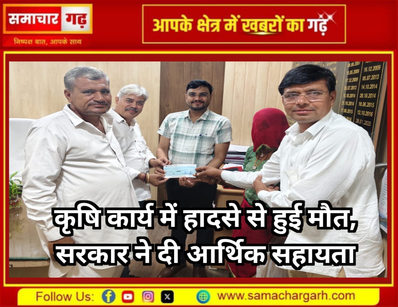समाचार गढ़ 25 सितंबर 2025 श्रीडूंगरगढ़। कृषि कार्य करते समय ट्रैक्टर हादसे में जान गंवाने वाले दानाराम लोहार के परिवार को राज्य सरकार की ओर से आर्थिक सहयोग प्रदान किया गया। गुरुवार को कृषि मंडी सचिव बीकानेर एवं विधायक पुत्र शिवजी सारस्वत ने दानाराम की पत्नी जाना देवी लोहार को दो लाख रुपए का चेक सौंपा। जाना देवी ने सहायता राशि मिलने पर राज्य सरकार के प्रति आभार जताया और कहा कि इस सहयोग से परिवार को संबल मिलेगा।