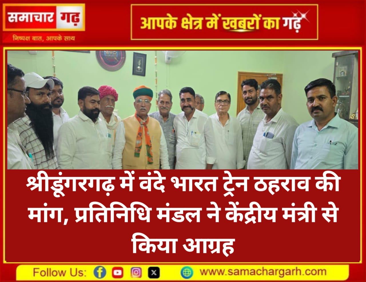 प्रतिनिधि मंडल ने मेघवाल से वंदे भारत ट्रेन का ठहराव श्रीडूंगरगढ़ में करवाने का आग्रह किया। उन्होंने कहा कि यदि श्रीडूंगरगढ़ में इस गाड़ी का ठहराव होता है तो पूरे श्रीडूंगरगढ़ विधानसभा क्षेत्र के सभी वर्गों के लोगों को लाभ मिलेगा।