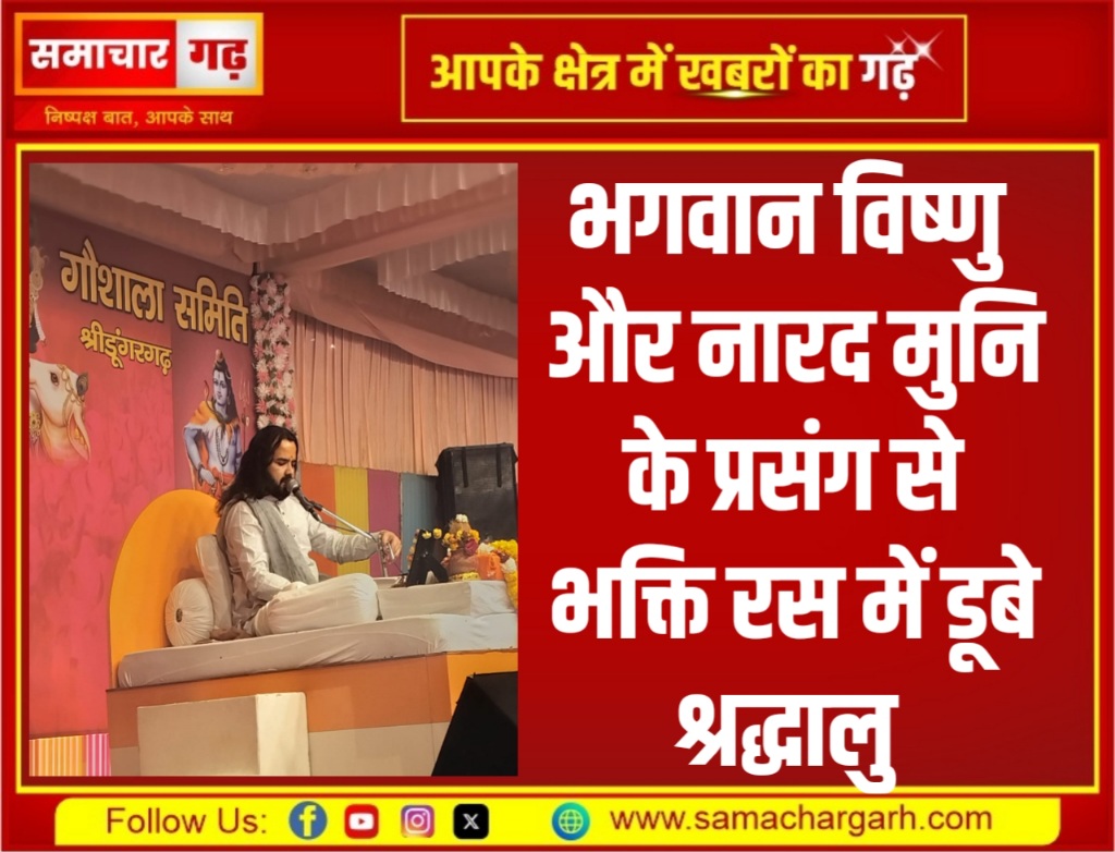 समाचार गढ़ 21 फरवरी 2025 श्रीडूंगरगढ़। श्री गौ माता भंडारा गौशाला समिति द्वारा सनातन श्मशान भूमि में आयोजित गौ सेवार्थ शिव महापुराण कथा के दूसरे दिन शुक्रवार को श्रद्धालु भक्ति रस में सराबोर हो गए। कथा में व्यासपीठ पर विराजमान भाई संतोष सागर जी ने नारद मुनि के चरित्र पर प्रकाश डालते हुए भगवान विष्णु और नारद मुनि के मिलन का प्रसंग सुनाया।