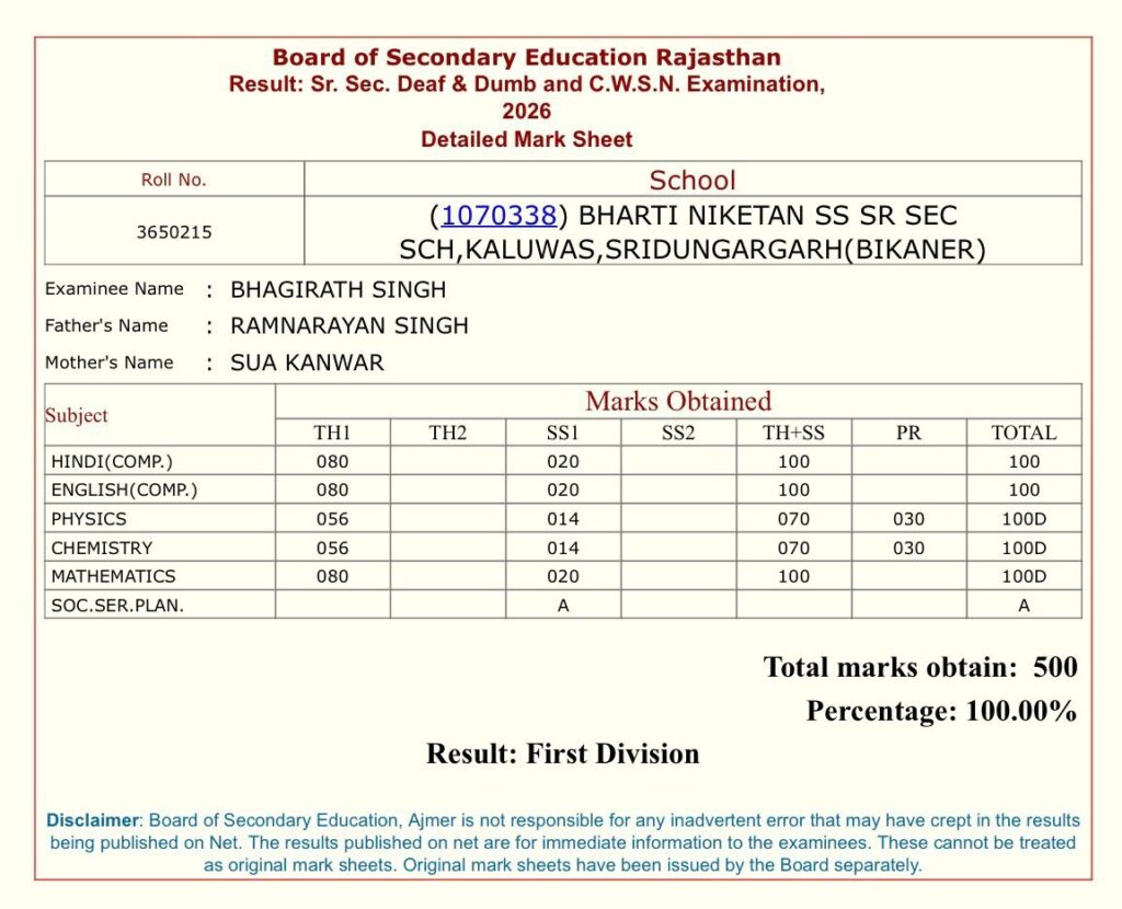 राजस्थान माध्यमिक शिक्षा बोर्ड, अजमेर द्वारा 12वीं कक्षा का परिणाम पांच दिन पहले मंगलवार को घोषित किया गया था। उसी क्रम में शनिवार को दिव्यांग विद्यार्थियों का परिणाम जारी हुआ, जिसमें भागीरथ सिंह ने शत-प्रतिशत अंक हासिल कर सबको चौंका दिया। उन्होंने हिंदी, अंग्रेजी, भौतिकी, रसायन विज्ञान और गणित—सभी विषयों में 100-100 अंक प्राप्त किए।