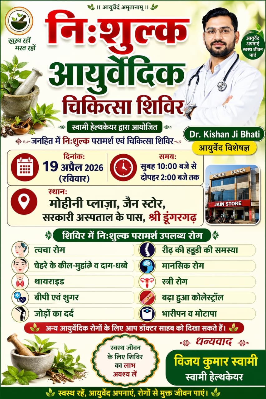मूल्य: MRP ₹ 10500, कैम्प रेट ₹3800इसके अलावा शिविर में कई महत्वपूर्ण जांचें मात्र ₹10-10 रुपए में भी की जाएंगी। भीड़ से बचने के लिए इच्छुक लोग 8302953656 पर अपना अग्रिम पंजीकरण करवा सकते हैं। सही जांच से ही सही उपचार संभव है।रविवार को सुप्रसिद्ध आयुर्वेद चिकित्सक डॉ. किशन भाटी अपनी निशुल्क सेवाएं देंगे।