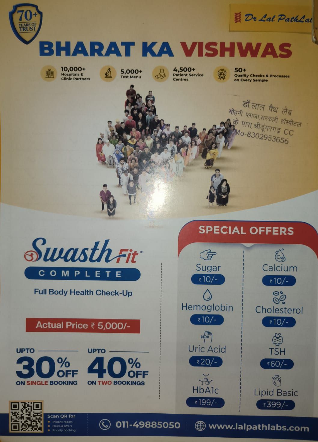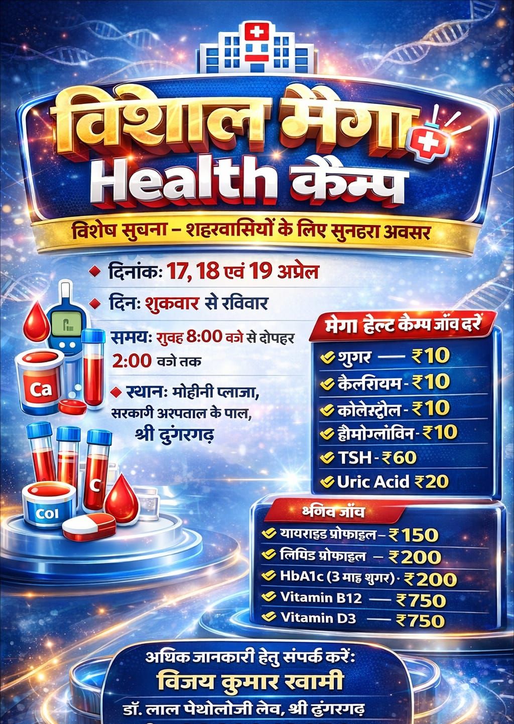 समाचार गढ़, 17 अप्रैल 2026। श्रीडूंगरगढ़ कस्बे में आज 17 अप्रैल से 19 अप्रैल तक तीन दिवसीय महा बचत ऑफर के तहत डॉ. लाल पैथ लैब में मात्र 3800 रूपए में फुल बॉडी चेकअप किया जा रहा है। मोहिनी प्लाजा में स्थित डॉ लाल पैथ लैब में मेगा हेल्थ चैकअप कैंप का आयोजन शुक्रवार, शनिवार व रविवार की सुबह 8 बजे से दोपहर 2 बजे तक आयोजित किया जाएगा। स्थानीय शाखा के विजय स्वामी ने बताया कि हीमोग्लोबिन, कैल्शियम, शुगर, कोलेस्ट्रॉल, यूरिक एसिड, TSH सहित 6 महत्वपूर्ण टेस्ट मात्र ₹120 में किए जाएंगे।