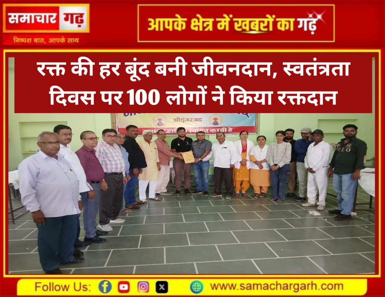 समाचार गढ़ 15 अगस्त 2025 श्रीडूंगरगढ़। स्वतंत्रता दिवस के अवसर पर नागरिक विकास परिषद, श्रीडूंगरगढ़ द्वारा 15 अगस्त 2025 को आडसर बास स्थित एनवीपी भवन में विशाल रक्तदान शिविर आयोजित किया गया। शिविर में पीबीएम अस्पताल, बीकानेर के ब्लड बैंक की टीम डॉ. कुलदीप नेहरा के नेतृत्व में आवश्यक उपकरणों के साथ रक्त संग्रहण हेतु पहुंची।