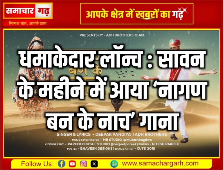 समाचार गढ़, 22 जुलाई 2025, श्रीडूंगरगढ़। सावन के सुहाने मौसम में एक नया धमाकेदार राजस्थानी सॉन्ग ‘नागण बन के नाच’ रिलीज हो गया है। इस गाने को अपनी सुमधुर आवाज़ में दीपक पंडिया ने गाया है, वहीं इसके बोल भी खुद दीपक पंडिया ने लिखे हैं। म्यूज़िक और मिक्स मास्टरिंग एमबी स्टूडियो @मुस्ताक बगड़वा द्वारा की गई है।