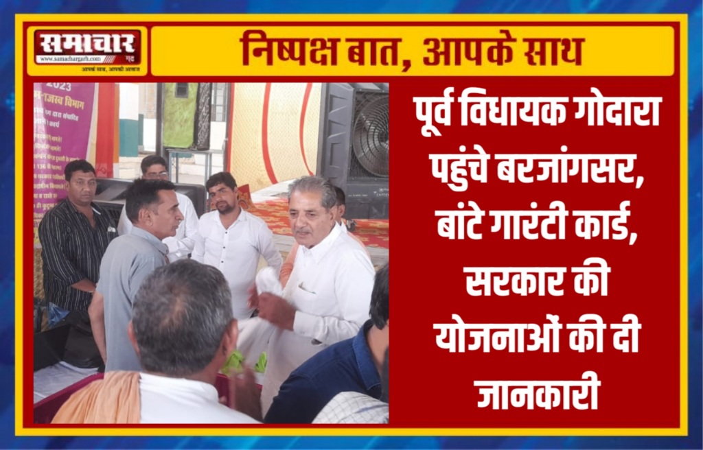 समाचार-गढ़, 12 जून 2023। राजस्थान सरकार द्वारा आमजन को राहत प्रदान करने के लिए महंगाई राहत कैम्प का आयोजन किया जा रहा है पिछले काफी समय से प्रदेश के शहर, कस्बे ओर गांवो में कैम्पों के माध्यम से आमजन को राहत कार्ड दिए जा रहे है। श्रीडूंगरगढ़ में पूर्व विधायक मंगलाराम गोदारा लगातार इन कैम्पों में जाकर आमजन से रूबरू हो रहे है। आज बरजांगसर में गोदारा ने महंगाई राहत केम्प में पहुंचे और गारंटी कार्ड वितरित किये। इस दौरान पूर्व विधायक गोदारा ने गोद भराई भी करवाई। सरकार की जनकल्याणकारी योजनाओं की जानकारी ग्रामीणों को देते हुए सभी को इन योजनाओं से जुड़ने की बात कही। इस दौरान तहसीलदार राजवीर कड़वासरा, सरपंच, सुभाष पूनिया, मीडिया प्रभारी राजेश मंडा सहित अनेक ग्रामीण उपस्थित रहे।