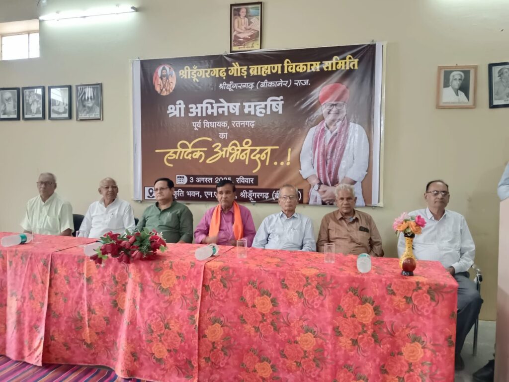 समाचार गढ़, 3 अगस्त 2025। श्रीडूंगरगढ़ गौड़ ब्राह्मण विकास समिति की ओर से राष्ट्रीय राज मार्ग स्थित संस्कृति भवन में रविवार को आयोजित कार्यक्र में रतनगढ़ के पूर्व विधायक अभिनेश महर्षि का सम्मान किया गया। कार्यक्रम में समाज को मजबूत व सशक्त बनाने और इसके उत्थान को लेकर विशेष चर्चा की गई।