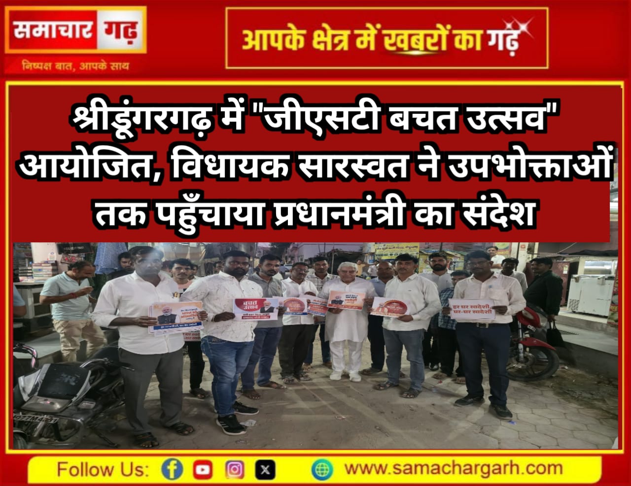 श्रीडूंगरगढ़ विधानसभा क्षेत्र में आज “जीएसटी बचत उत्सव” का आयोजन किया गया। इस अवसर पर विधायक ताराचंद सारस्वत ने मुख्य बाजार में व्यापारियों, वेंडरों एवं उपभोक्ताओं से संवाद किया और प्रधानमंत्री नरेंद्र मोदी के नेतृत्व में भारत सरकार द्वारा किए गए ऐतिहासिक Next Generation GST सुधारों की जानकारी साझा की।