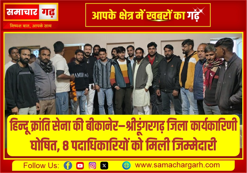 हिन्दू क्रांति सेना की बीकानेर–श्रीडूंगरगढ़ जिला कार्यकारिणी घोषित, 8 पदाधिकारियों को मिली जिम्मेदारी
