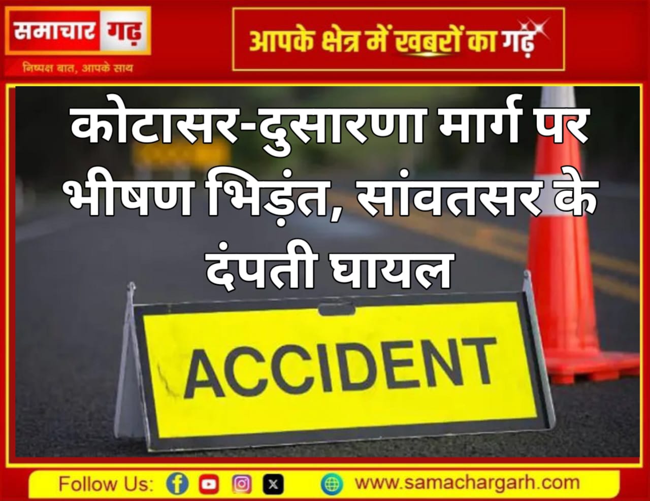 गुरुवार दोपहर को कोटासर-दुसारणा मार्ग पर एक तेज रफ्तार बोलेरो और बाइक के आमने-सामने भिड़ जाने से सड़क पर अफरा-तफरी मच गई। हादसे में सांवतसर निवासी बनवारीलाल (लखन) विश्नोई और उनकी पत्नी घायल हो गए।