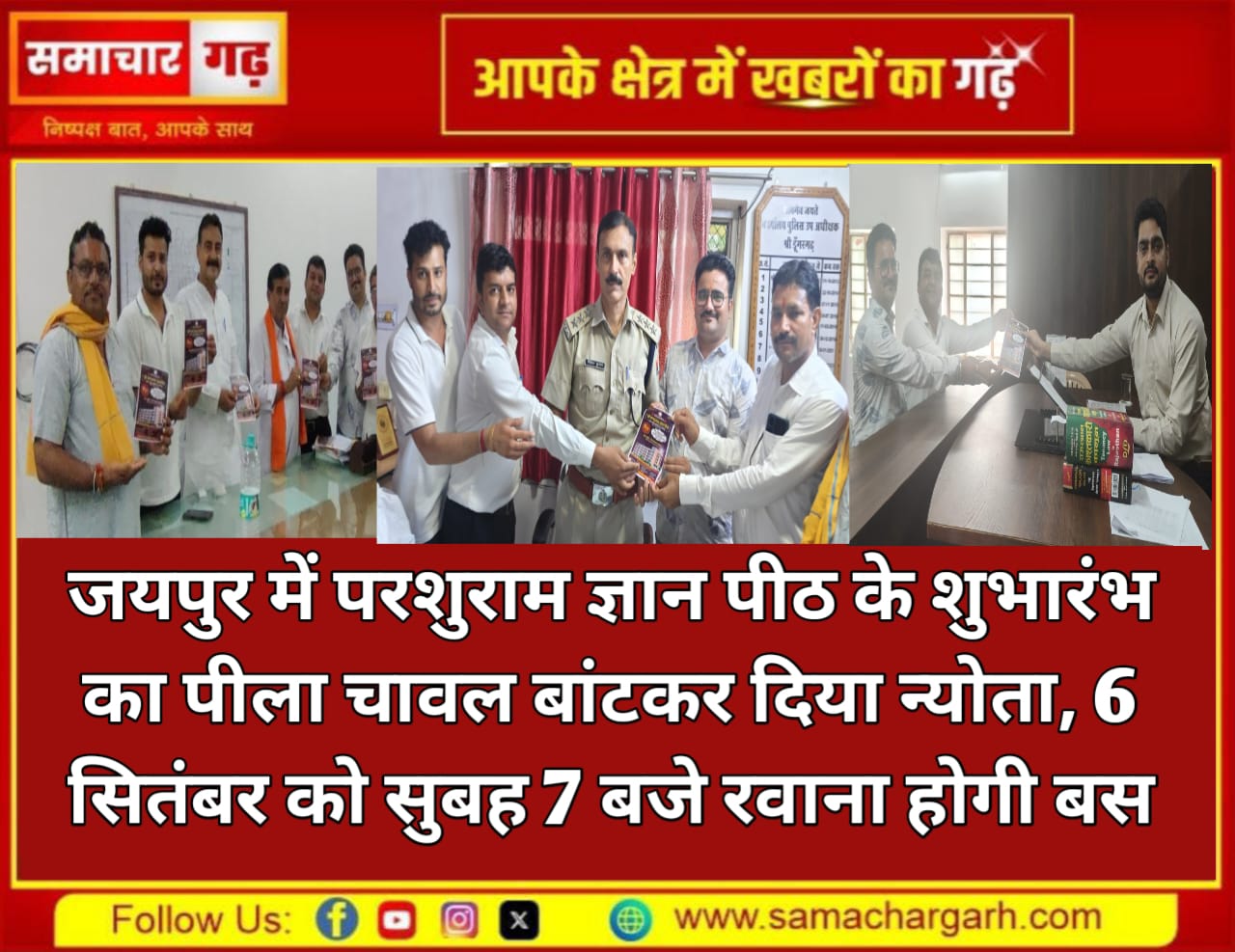 समाचार गढ़ 5 सितंबर 2025 श्रीडूंगरगढ़। राजधानी जयपुर में 6 सितंबर को होने वाले परशुराम ज्ञान पीठ के भव्य शुभारंभ के लिए विप्र फाउंडेशन की ओर से शुक्रवार को कस्बे में पीला चावल वितरण कर स्नेह निमंत्रण दिया गया। तहसील कार्यालय के सामने और मार्केट में पीला चावल बांटकर समाजजनों को कार्यक्रम में शामिल होने का आवाह्न किया गया।