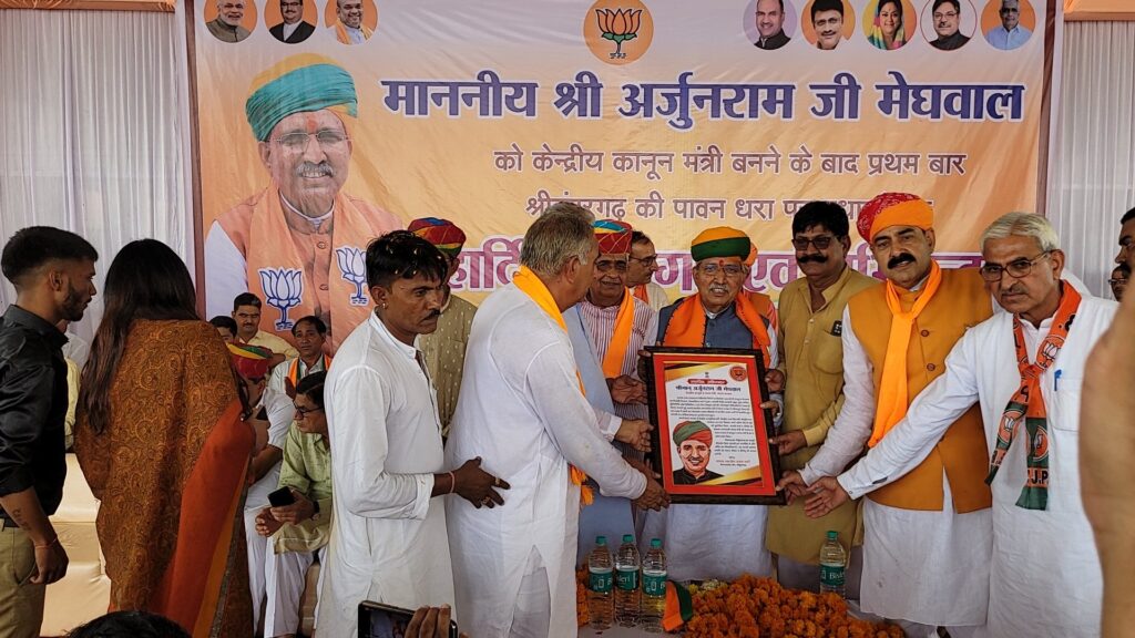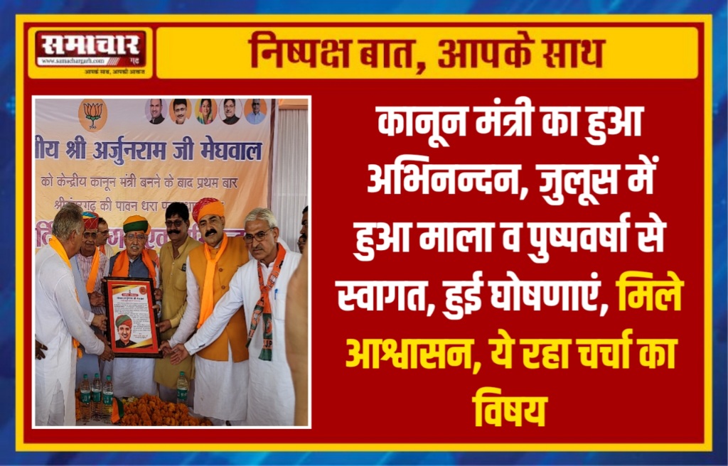 समाचार-गढ़ 30 मई 2023। कानून मंत्री बनने के बाद आज पहली बार अर्जुनराम मेघवाल सुबह 10 बजे श्रीडूंगरगढ़ पहुंचे। इससे पहले श्रीडूंगरगढ़ की सीमा कीतासर में पहुंचने पर पार्टी कार्यकर्ताओं ने उनका स्वागत किया। जिसके बाद घूमचक्कर पहुंचने पर पार्टी पदाधिकारियों व कार्यकर्ताओं ने जोशीले अंदाज में कानूनू मंत्री अर्जुनराम मेघवाल का फूल मालाओं व पुष्पवर्षा कर स्वागत किया गया। उसके बाद जीप के माध्यम से जुलूस के रूप में स्टेशन रोड़, मैन बाजार, पुस्तकालय, घास मण्डी रोड़, रानी बाजार होते हुए मेघवाल कार्यकर्ताओं के साथ कालूबास स्थित तेरापंथ भवन धोलिया नोहरा पहुचे। घुमचक्कर स्वागत द्वार पर अल्पसंख्यक मोर्चा के जिलाध्यक्ष इमरान राइन के नेतृत्व सांसद मेघवाल का जोरदार स्वागत किया गया। इस दौरान अर्जुनराम मेघवाल का जगह-जगह फूलमालाओं व पुष्पवर्षा कर स्वागत-अभिनन्दन किया गया। जीप में खड़े मेघवाल ने भी सबका अभिवादन हाथ जोड़कर स्वीकार किया। तेरापंथ भवन में मेघवाल का पार्टी पदाधिकारियों व कार्यकर्ताओं ने कानून मंत्री अर्जुनराम मेघवाल का प्रशस्ति पत्र देकर नागरिक अभिनन्दन किया। अर्जुनराम मेघवाल ने संबोधित करते हुए प्रधानमंत्री नरेन्द्र मोदी के 9 साल पूरे होने पर उनके द्वारा किए गए देशहित के कार्यों से अवगत करवाया। आगे आने वाले चुनाव में अभी से जुट जाने का आह्वान करते हुए उन्होंने कहा कि आमजन तक भाजपा सरकार द्वारा किए गए विकास कार्याे को आमजन तक पहुंचाए। इस अवसर पर भाजपा नेता तारचन्द सारस्वत, बृजलाल तावणियां, लकेश चौधरी, मानमल शर्मा, रामगोपाल सुथार, विनोद गिरी गुंसाई, छैलूसिंह शेखावत, रामेश्वरलाल पारीक, किशनाराम गोदारा, शिवकुमार स्वामी, कुंभाराम सिद्ध, श्याम सारस्वत हेमासर, बजरंग सारस्वत मंच पर उपस्थित रहे एवं बीकानेर से आए गुमानसिंह राजपुरोहित, जालमसिंह भाटी, जिला प्रभारी ओमप्रकाश सारस्वत, लूणकरणसर विधायक सुमित गोदारा ने संबोधित किया व मेघवाल को केन्द्रीय काननू मंत्री बनाने पर मोदी सरकार का आभार जताया।