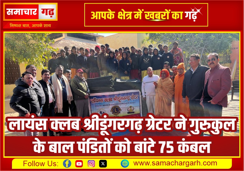 समाचार गढ़, श्रीडूंगरगढ़। लायंस क्लब श्रीडूंगरगढ़ ग्रेटर द्वारा शीत ऋतु साप्ताहिक सेवा कार्यक्रम के अंतर्गत एक सराहनीय पहल की गई। क्लब के सभी पदाधिकारियों एवं सदस्यों के आर्थिक सहयोग से श्रीडूंगरगढ़ संस्कृत विद्यालय स्थित गुरुकुल में शिक्षा ग्रहण कर रहे बाल पंडितों को 75 कंबलों का वितरण किया गया।