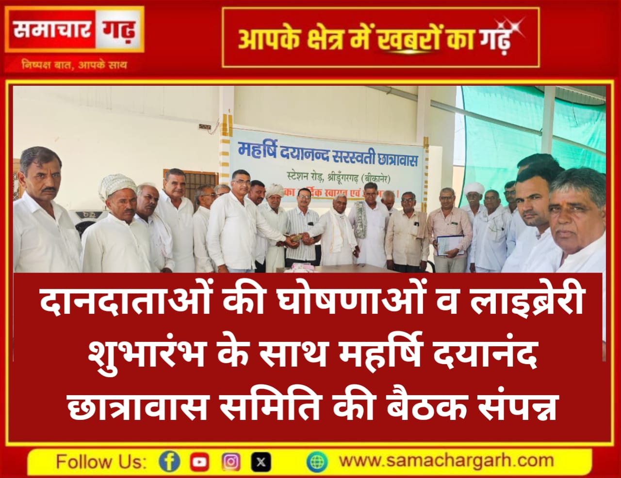 महर्षि दयानंद सरस्वती छात्रावास विकास समिति की बैठक एडवोकेट श्यामसुंदर आर्य की अध्यक्षता में आयोजित हुई। मंत्री सुशील सेरडिया ने भवन निर्माण कार्य की प्रगति रिपोर्ट और 3.23 करोड़ की आय–व्यय रिपोर्ट प्रस्तुत की। बैठक में संत कर्मा बाई बालिका छात्रावास में लाइब्रेरी का शुभारंभ हुआ तथा विभिन्न दानदाताओं ने छात्रावास भवन निर्माण, सीसीटीवी कैमरे और आर्थिक सहयोग की घोषणाएं की। आगामी 28-29 सितम्बर को लोकनायक लूणाराम सारण की पुण्यतिथि पर आयोजित होने वाले दो दिवसीय कार्यक्रम की रूपरेखा भी तय की गई। बैठक में बड़ी संख्या में समाजजन व छात्र उपस्थित रहे।