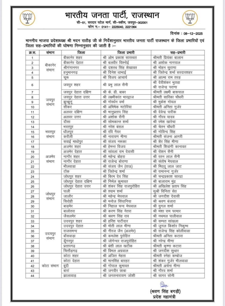 बीजेपी राजस्थान संगठन में बड़ा फेरबदल — बीकानेर संभाग में नए जिला प्रभारियों की घोषणा