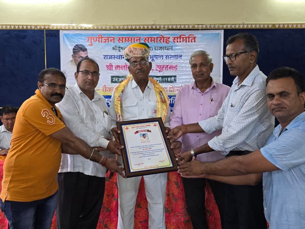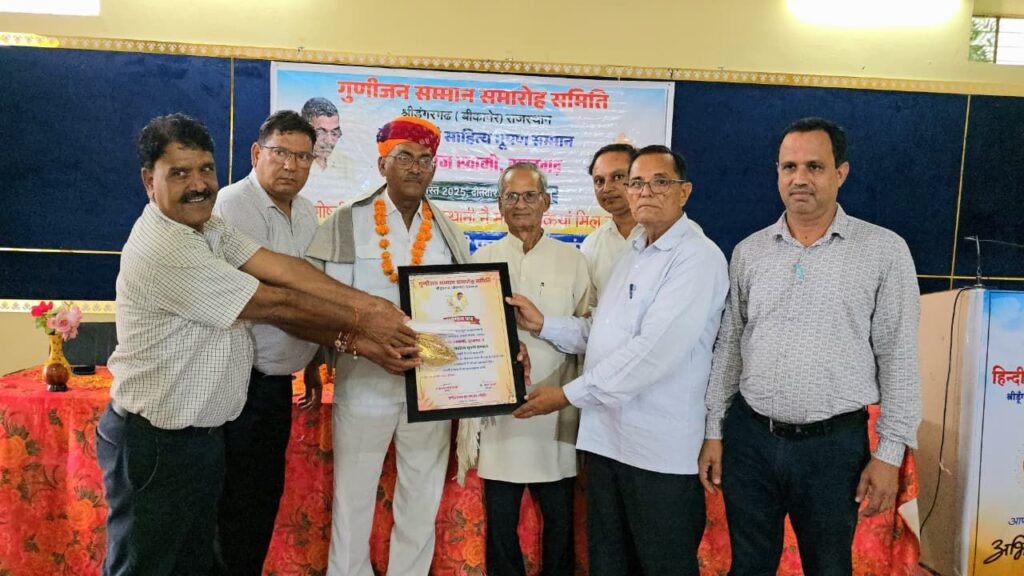 समाचार गढ़ 24 अगस्त 2025 राजस्थानी रामलीला के लेखक और राजस्थानी भाषा मान्यता आंदोलन के प्रखर कार्यकर्ता मनोज स्वामी को आज श्रीडूंगरगढ़ की गुणीजन सम्मान समारोह समिति द्वारा राजस्थानी साहित्य भूषण सम्मान प्रदान किया गया। इस अवसर पर उन्हें एक लाख रुपये की राशि, शॉल, श्रीफल और प्रशस्ति-पत्र भेंट किए गए।