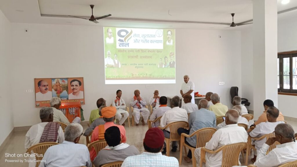 समाचार-गढ़, 12 जून 2023। श्रीडूंगरगढ़ के भाजपा कार्यालय में वरिष्ठ कार्यकर्ताओं के साथ भोजन पर वार्तालाप कार्यक्रम हुआ । जिसमें जनता पार्टी के समय से जुड़े पुराने और वरिष्ठ पार्टी कार्यकर्ताओं के साथ भोजन हुआ तथा वार्तालाप हुई तथा प्रधानमंत्री नरेन्द्र मोदी के सफलतम 9 वर्षों पर चर्चा हुई। भारत माता, प.दीनदयाल उपाध्याय, श्यामाप्रसाद मुखर्जी के आगे द्वीप प्रजवल्लन के साथ कार्यक्रम शुरू हुआ। इस दौरान बीकानेर देहात जिला प्रभारी ओम सारस्वत चूरू ने केन्द्र सरकार की जन कल्याणकारी योजनाओं के बारें में बताते हुए सफलतम 9 वर्षों की उपलब्धियों पर संबोधित किया। कार्यक्रम की अध्यक्षता श्रीडूंगरगढ़ भाजपा के संस्थापक सदस्यों में रहे दुलीचंद श्यामसुखा ने की। पूर्व जिलाध्यक्ष ताराचंद सारस्वत ने सभी वरिष्ठ कार्यकर्ताओं का सम्मान करते हुए प्रधानमंत्री मोदी के सफलतम 9 वर्षों के बारे में उपलब्धियां बताई। पूर्व जिलाध्यक्ष रामगोपाल सुथार ने लाभार्थियों के बारे में बताते हुए योजनाएं बताई। कार्यक्रम के जिला संयोजक शिव स्वामी ने संचालन करते हुए वरिष्ठ और पुराने कार्यकर्ताओं के जीवन परिचय बताया। इस दौरान वरिष्ठ कार्यकर्ता पूर्व सरपंच हडमान व्यास ने सभी का धन्यवाद ज्ञापित किया। चेयरमैन मानमल शर्मा, महावीर प्रसाद धामा, हेमनाथ जाखड़, श्रवण कुमार गुरनानी, श्रवण कुमार नाई, रतन सिंह राजोतिया, गणेश सिंह बिका, रेवंतसिंह शेखावत, लीलू वर्मा, जगदीश मोदी, गुलाब सोनी,छगनलाल नाई, महेश राजोतिया, रघुवीर सिंह शेखावत, पेमाराम सांसी, जगदीश गुर्जर, ओमनाथ सिद्ध, भंवरलाल शर्मा, इंद्रचंद तापड़िया,शिव भगवान मूंधड़ा,बंशीलाल,राधेश्याम जोशी, भंवर नाथ गोदारा, फुसाराम पारीक सहित वरिष्ठ कार्यकर्ता शामिल हुए।