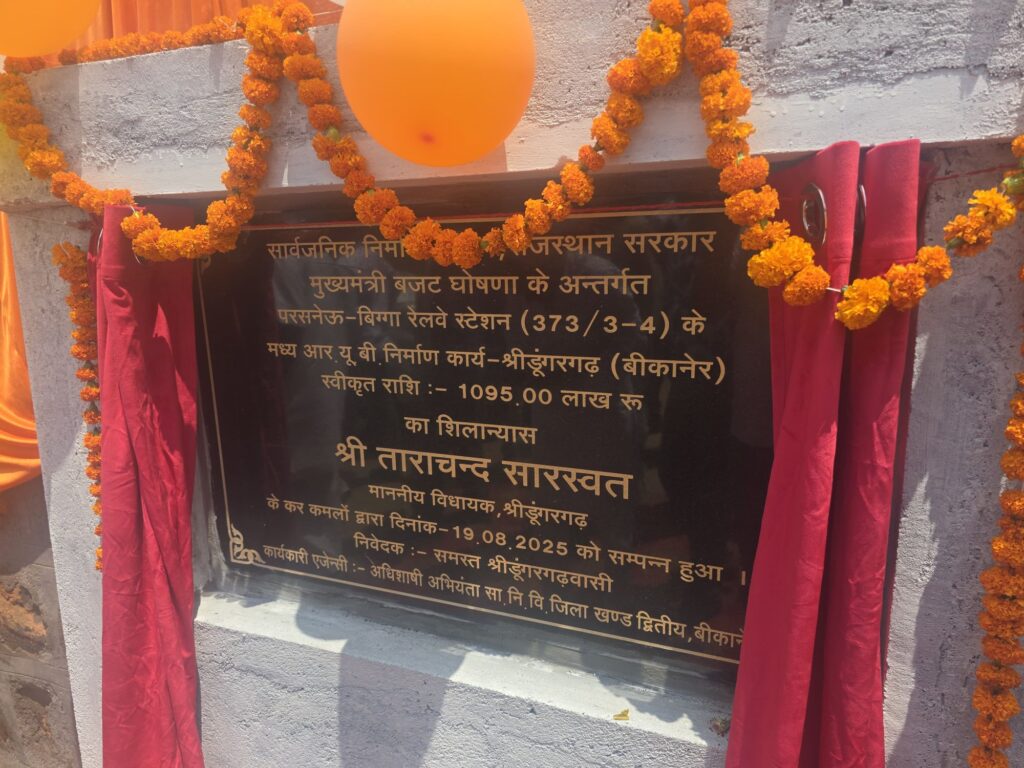 समाचार गढ़ 19 अगस्त 2025 श्रीडूंगरगढ़/बीकानेर। मुख्यमंत्री बजट घोषणा के अंतर्गत सार्वजनिक निर्माण विभाग, राजस्थान द्वारा स्वीकृत परसनेऊ-बिग्गा रेलवे स्टेशन (373/3-4) के मध्य बनने वाले रेलवे अंडरब्रिज (आरयूबी) का शिलान्यास मंगलवार को श्रीडूंगरगढ़ विधायक ताराचंद सारस्वत ने बिग्गा गांव में हजारों ग्रामवासियों की मौजूदगी में किया।