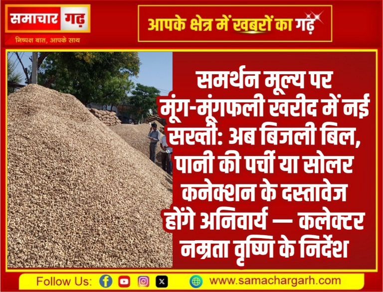 समाचार गढ़, 5 नवंबर 2025, बीकानेर। जिला कलेक्टर नम्रता वृष्णि ने मूंग-मूंगफली की समर्थन मूल्य पर खरीद मामले में मिल रही शिकायतों के मद्देनजर बिजली बिल या पानी की पर्ची या सोलर कनेक्शन के दस्तावेजों को भी अनिवार्य कर दिया है। जिला कलेक्टर नम्रता वृष्णि ने मंगलवार को जिले की सभी क्रय विक्रय सहकारी समितियों के मुख्य व्यवस्थापकों को पत्र लिखकर निर्देशित किया है कि राजफैड के निर्देशानुसार पंजीयन संबंधी दस्तावेजों के भौतिक सत्यापन के साथ ही कृषक का बिजली बिल या पानी की पर्ची या सोलर कनेक्शन के दस्तावेज भी संबंधित कृषक से तुलाई के समय मंगवाये जाएं तथा सत्यापन उपरांत ही तुलाई करके इनका रिकॉर्ड समिति पर संधारित रखा जाए।
