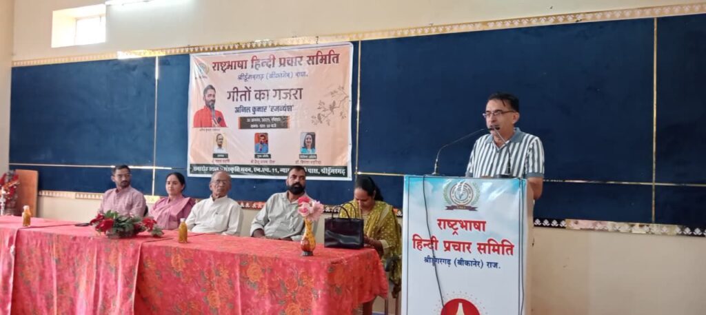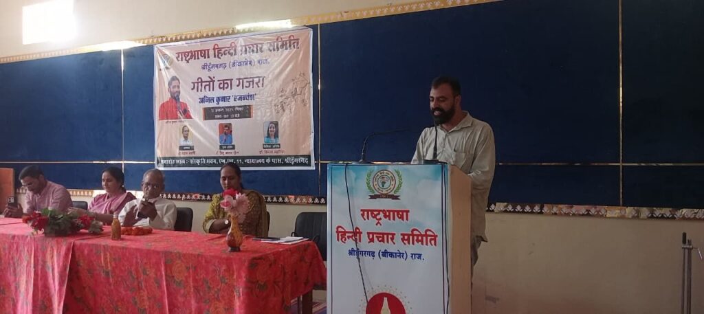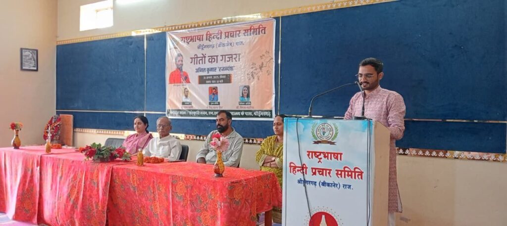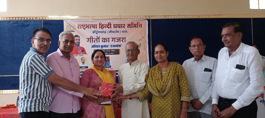 समाचार गढ़, श्रीडूंगरगढ़ 31 अगस्त 2025। राष्ट्रभाषा हिंदी प्रचार समिति द्वारा संस्कृति भवन में रविवार को ‘गीतों का गजरा’ सजाया गया। कवि अनिल कुमार ‘रजन्यंश’ ने “मन के मन के टूटे सब तार मन के, ठन के ठन के छूटे सब यार ठन के..“ सुनाकर खूब दाद बटोरी तो श्रृंगार रस का स्वरचित प्रतिनिधि गीत सुनाकर श्रोताओं को भाव विभोर किया। अनिल ने इंस्टाग्राम पर तंज कसते हुए जीवन में बढ़ते तकनीकी दखल पर चिंता भी जताई। कार्यक्रम में विशिष्ट अतिथि डॉ विमला महरिया ने मधूर स्वर में लोकगीत बावनिया सुनाकर हंसाया व लोकसंस्कृति की झलक सजाई। विमला ने होली के रंग पर व्यंग्य सुनाया जिसमें बढ़ती तकनीक के कारण होली का रंग फीका पड़ जाने को केंद्रित किया। कवि प्रदीप महरिया ने भी आज की राजनीति पर कटाक्ष करते हुए नेता और भ्रष्टाचारी को राजस्थानी गीत में अच्छा लपेटा। वहीं कार्यक्रम में मुख्य अतिथि छैलू चारण ‘छैल’ ने करणी अराधना से काव्यपाठ प्रारंभ किया और वात्सल्य रस पर भावभरा छंद सुनाया। छैल ने राजस्थानी भाषा को मान्यता नहीं मिलने का दोष राजनीति को देते हुए ‘नेतावां को करें गणुगान निज मान भूल गया..’ का ओलमा भी लिखने वालों को दिया। छैल ने श्रृंगार रस में भी सुनाया। संस्था द्वारा सभी कवियों का सम्मान किया गया। कार्यक्रम अध्यक्ष श्याम महर्षि ने युवाओं को जिम्मेदारी पूर्ण कार्य करने की प्रेरणा देते हुए, साहित्य की काव्य विधा को संवर्द्धित करने में योगदान देने की बात कही। सत्यदीप भोजक ने सभी का आभार व्यक्त किया। कवियत्री भगवती पारीक ‘मनु’ ने मंच संचालन किया।