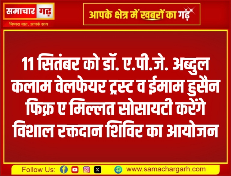 ईद मिलादुन्नबी के पावन अवसर पर डॉ. ए.पी.जे. अब्दुल कलाम वेलफेयर ट्रस्ट एवं ईमाम हुसैन फिक्र ए मिल्लत सोसायटी, श्रीडूंगरगढ़ द्वारा तीसरा विशाल रक्तदान शिविर आयोजित किया जाएगा। यह शिविर आगामी 11 सितम्बर 2025, प्रातः 9 बजे से सांय 6 बजे तक स्टेशन रोड स्थित जामा मस्जिद ग्राउंड में आयोजित होगा।