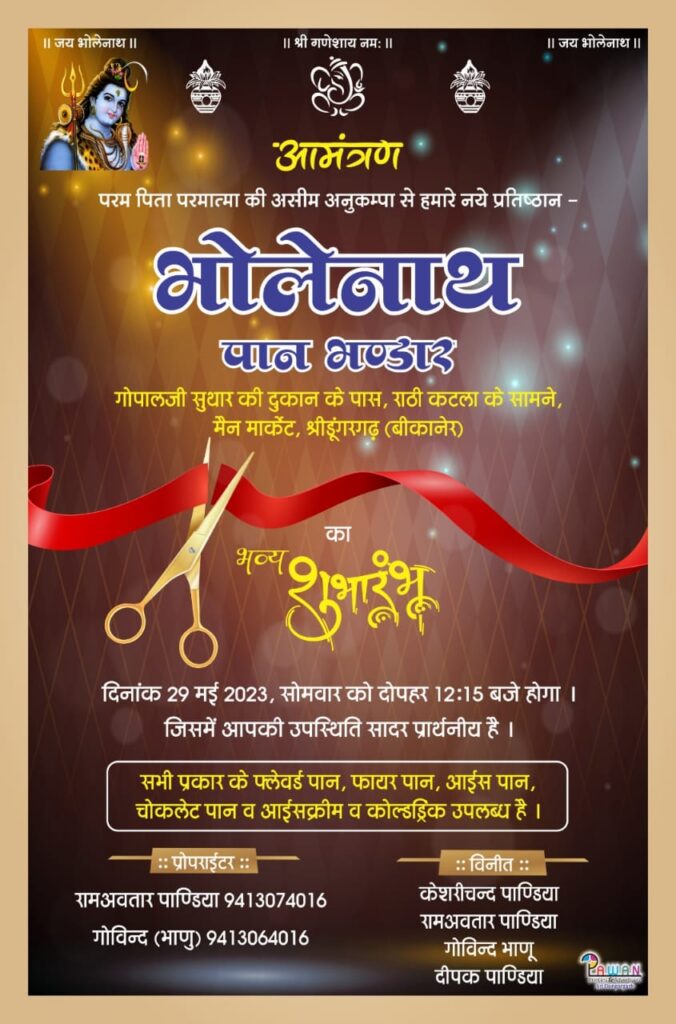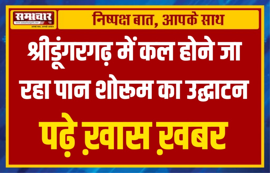 समाचार-गढ़, 28 मई 2023। बड़े-बड़े शहरों की तर्ज पर श्रीडूंगरगढ़ में भी अब कई प्रकार के शोरूम खुलने लगे हैं। जिससे नागरिकों को अपने मनपसंद चीज लेने का अवसर मिल रहा है। ऐसे में कल 29 मई को भी भोलेनाथ पान भंडार (न्यू पान शोरूम) का उद्घाटन होने जा रहा है। शोरूम के मालिक रामअवतार पाण्डिया ने बताया कि भोलेनाथ पान भंडार (शोरूम) जो कि गोपाल जी सुथार की दुकान के पास, राठी कटला के सामने स्थित है। जिसका उद्घाटन सोमवार को दोपहर 12:15 बजे होगा। शोरूम में सभी प्रकार के फ्लेवर्ड पान, फायर पान, आईस पान, चॉकलेट पान व आइसक्रीम व कोल्ड्रिंक उपलब्ध रहेगी। गोविन्द बोहरा (भाणु) ने बताया कि हमारा एक ओर प्रतिष्ठान भोलेनाथ पान भंडार के ही नाम से वर्षो से गोपाल दास जी मिठाई की दुकान के पास संचालित है। जिसके बाद श्रीडूंगरगढ़ क्षेत्रवासियों के लिए सेवा में विस्तार करते हुए नये प्रतिष्ठान भोलेनाथ पान भंडार (न्यू पान शोरूम) की शुरुआत की जा रही है।