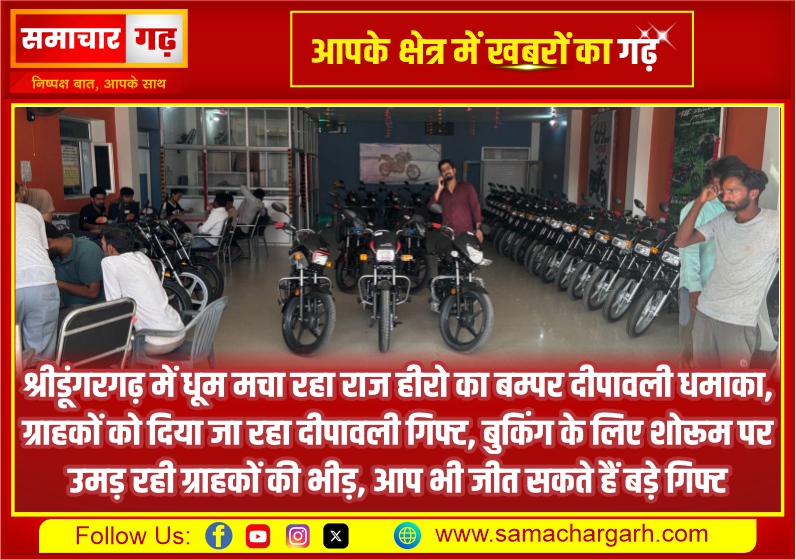 श्रीडूंगरगढ़ में धूम मचा रहा राज हीरो का बम्पर दीपावली धमाका, ग्राहकों को दिया जा रहा दीपावली गिफ्ट, बुकिंग के लिए शोरूम पर उमड़ रही ग्राहकों की भीड़, आप भी जीत सकते हैं बड़े गिफ्ट