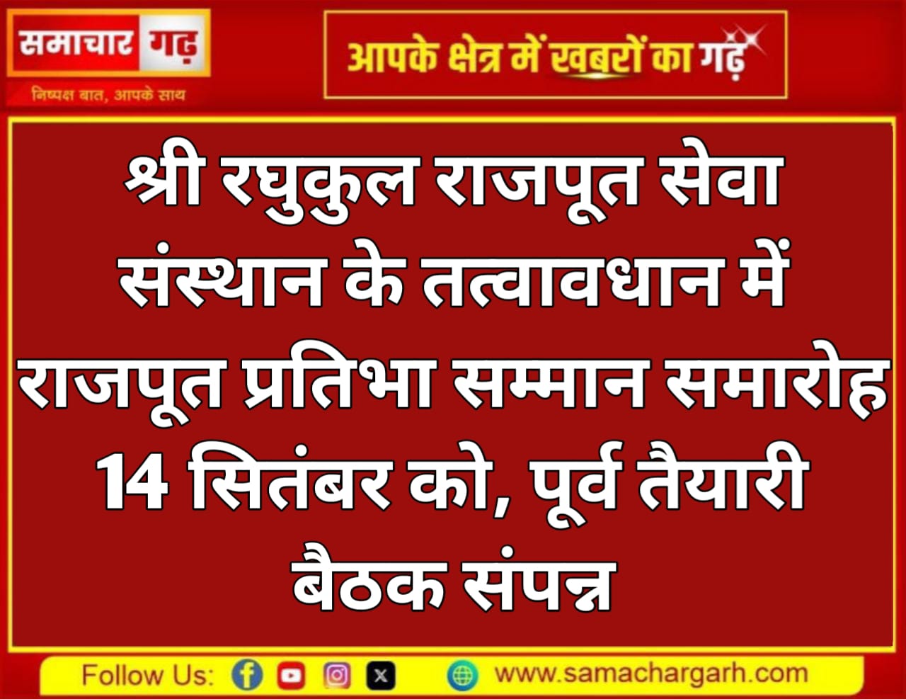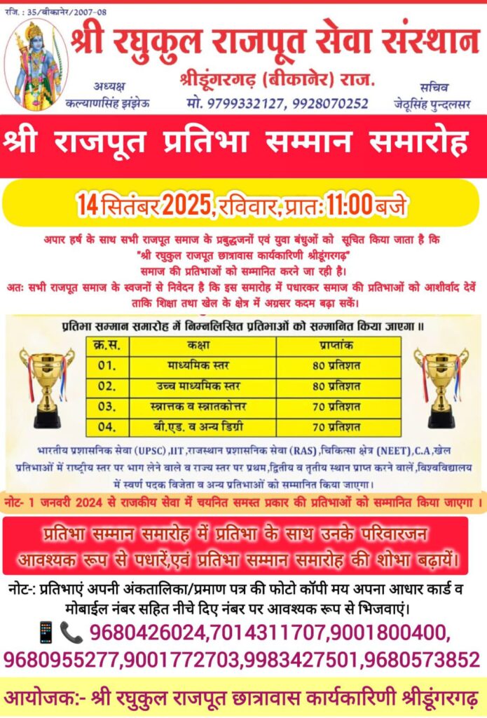 श्री रघुकुल राजपूत सेवा संस्थान के तत्वावधान में आगामी 14 सितंबर, रविवार को राजपूत प्रतिभा सम्मान समारोह आयोजित होगा। इस अवसर पर समाज की माध्यमिक एवं उच्च माध्यमिक स्तर पर सर्वाधिक अंक प्राप्त करने वाली प्रतिभाओं, राजकीय सेवाओं में चयनित अभ्यर्थियों, खेलों में उत्कृष्ट प्रदर्शन करने वाले खिलाड़ियों, स्थानीय जनप्रतिनिधियों एवं संस्थान को सहयोग देने वाले भामाशाहों का सम्मान किया जाएगा।