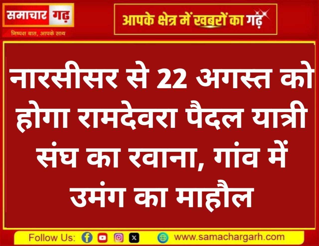 समाचार गढ़ 21 अगस्त 2025 श्रीडूंगरगढ़ क्षेत्र के गांव नारसीसर से रामदेवरा पैदल यात्री मां करणी संघ की रवानगी शुक्रवार सुबह गाजे-बाजे के साथ बाबा रामदेव जी महाराज के मंदिर में पूजा-अर्चना के बाद होगी।