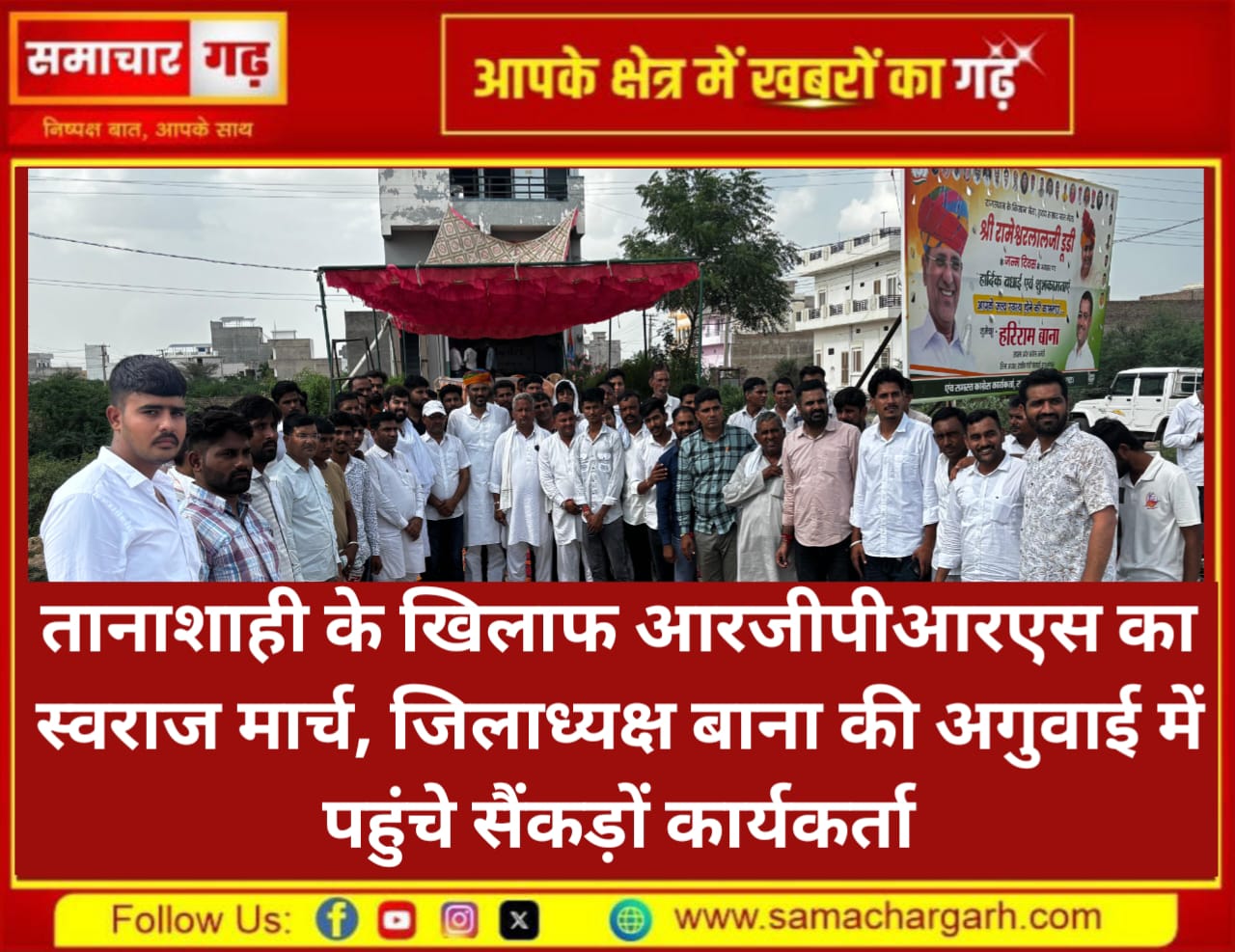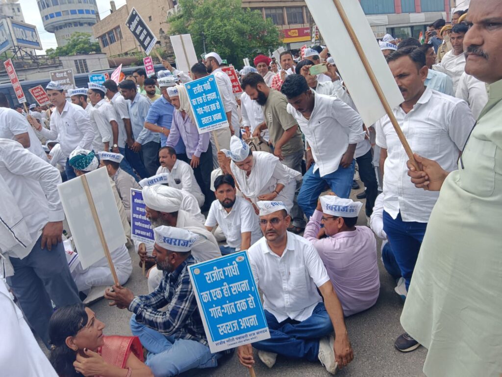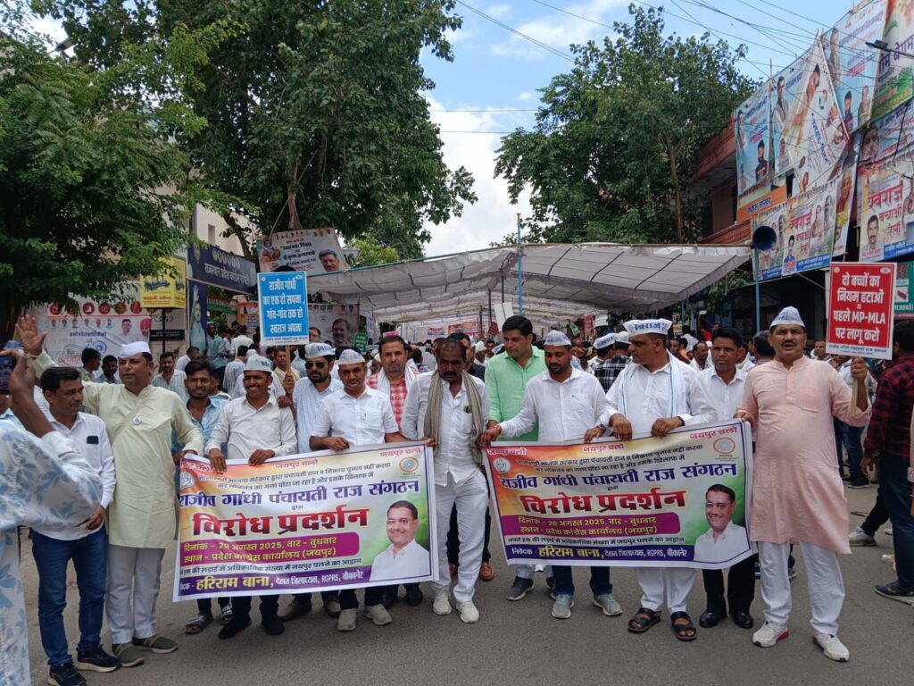 समाचार गढ़, 20 अगस्त 2025। पंचायती राज, निकाय एवं छात्रसंघ चुनाव नहीं करवा कर राज्य सरकार तानाशाही पर उतर आई है एवं इसके खिलाफ राजीव गांधी पंचायती राज संगठन द्वारा बुधवार को संगठन प्रदेशाध्यक्ष सीबी यादव के नेतृत्व में स्वराज मार्च निकाला। इसमें भाग लेने के लिए संगठन के बीकानेर देहात जिलाध्यक्ष हरिराम बाना की अगुवाई में जिले भर से सैंकड़ों कार्यकर्ता भी जयपुर पहुंचे। प्रदेश भर से राजीव गांधी पंचायती राज संगठन के कार्यकर्ता पहले प्रदेश कांग्रेस कार्यालय मुख्यालय पहुंचे एवं वहां स्वराज संवाद भी पार्टी नेताओं ने कार्यकर्ताओं से किया। संवाद के दौरान कार्यकर्ता चरखा कातते नजर आए एवं संवाद में बीकानेर जिले की ओर से जिलाध्यक्ष हरिराम बाना ने भी पंचायती राज में पूर्व प्रधानमंत्री राजीव गांधी के योगदान याद करते हुए राज्य सरकार पर निशाना साधा एवं हार के डर से सरकार द्वारा चुनाव नहीं करवाने की बात कही। इस प्रदर्शन में बाना के साथ क्षेत्र से संभाग प्रभारी विमल भाटी, जिला उपाध्यक्ष शिवराज गोदारा, भंवरलाल गोदारा, ओमप्रकाश जाखड़, बाबुलाल गोदारा, मनोज विश्नोई, रामनिवास विश्नोई, लतीफ खान, राजेन्द्र जांघू, राधेश्याम सिद्ध, देवनाथ सिद्ध, मुनीराम झोरड़, महेन्द्र कुकणा, गोपाल ज्याणी सहित जिले के सभी विधानसभा क्षेत्रों से कार्यकर्ता जयपुर पहुँचे।