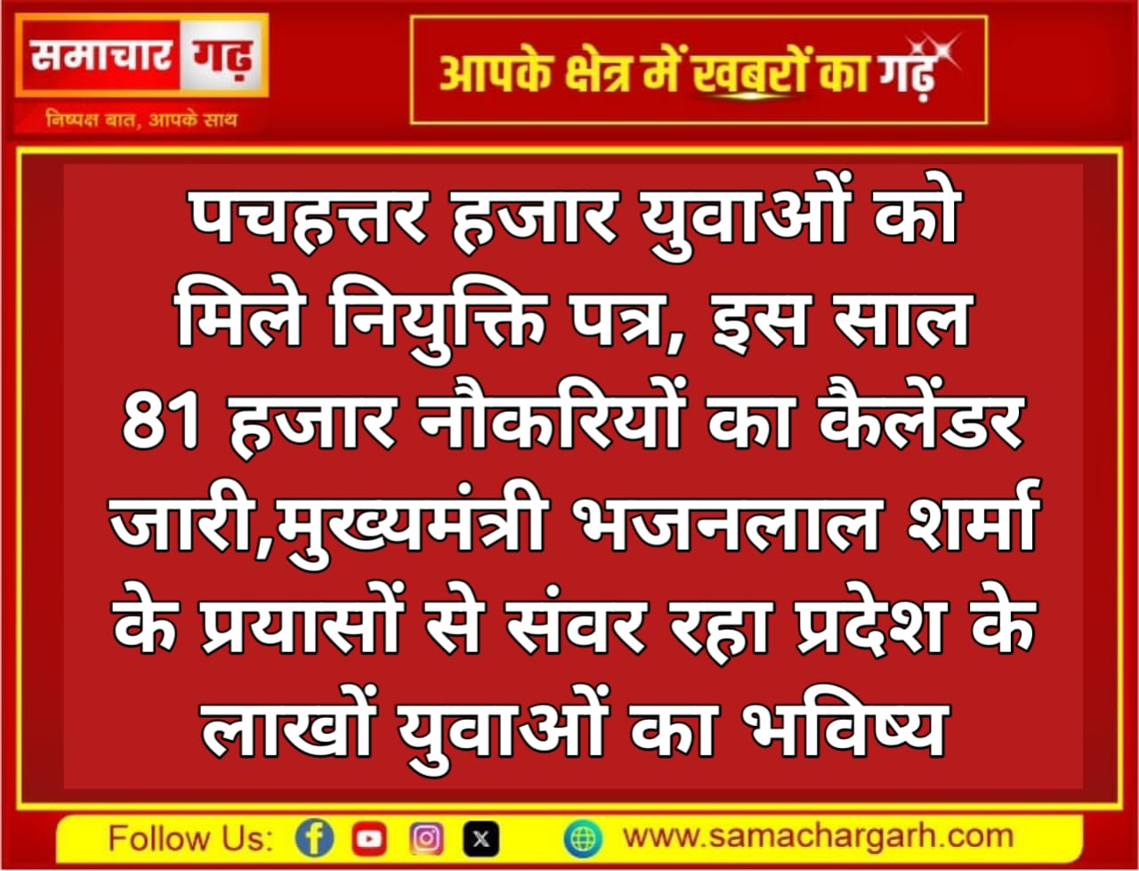 पचहत्तर हजार युवाओं को मिले नियुक्ति पत्र, इस साल 81 हजार नौकरियों का कैलेंडर जारी,मुख्यमंत्री भजनलाल शर्मा के प्रयासों से संवर रहा प्रदेश के लाखों युवाओं का भविष्य