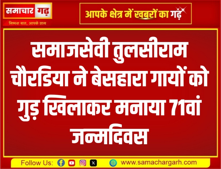समाचार गढ़, 3 सितंबर 2025,श्रीडूंगरगढ़। समाजसेवी तुलसीराम चौरडिया ने बुधवार को अपना 71वां जन्मदिवस अनूठे अंदाज़ में मनाया। उन्होंने कस्बे के विभिन्न मोहल्लों में विचरण कर रही बेसहारा गायों को गुड़ व चारा खिलाकर जन्मदिन का विशेष पर्व मनाया। इस दौरान चौरडिया ने खुले मैदानों में खड़ी व सड़कों पर विचरण कर रही गायों को अपने हाथों से गुड़ खिलाया। उनके इस कार्य को देख आसपास मौजूद लोग भी भावुक हो उठे और उनके इस सामाजिक सरोकार की सराहना की। गायों के प्रति सेवा भाव दिखाते हुए जन्मदिन मनाने के इस अवसर पर हनुमानमल कलाणी, कांति प्रसाद दर्जी और बजरंग ओझा, ओमप्रकाश नाई व लक्ष्मीनारायण सिंधी भी साथ रहे। चौरडिया ने कहा कि जन्मदिन जैसे अवसर पर जरूरतमंदों और मूक प्राणियों की सेवा करने से मन को सच्ची शांति और संतोष मिलता है।