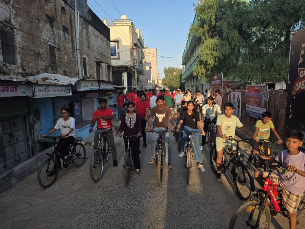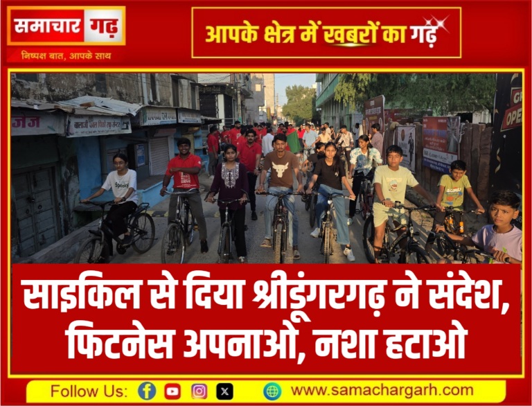 समाचार गढ़, 14 सितंबर 2025। श्रीडूंगरगढ़ में रविवार को अखिल भारतीय तेरापंथ युवक परिषद् निर्देशित तेयुप श्रीडूंगरगढ़ के तत्वावधान में “हिट युवा फिट युवा – संडे ऑन साइकिल” कार्यक्रम का भव्य आयोजन किया गया, जिसका मुख्य संदेश रहा “नशा मुक्त हो देश”। कार्यक्रम की शुरुआत साध्वी श्री संगीतश्रीजी के मंगल पाठ से हुई और साइक्लोथॉन रैली मुख्य बाजार से होते हुए गौरव पथ रोड, तोलियासर भेरुजी मंदिर, चंदा पीसीओ, पद्मावती क्रिएशन से गुजरकर मालू भवन पहुंची, जहां युवाओं ने स्वास्थ्य, फिटनेस और नशा मुक्ति का संदेश दिया। संयोजक रौनक पारख ने बताया कि इस आयोजन को 17 सितंबर को होने वाले MBDD 2025 कैंपेनिंग से जोड़कर युवाओं ने समाज में सकारात्मक संदेश फैलाया, वहीं सह संयोजक गौरव बोथरा ने कहा कि “स्वस्थ जीवन शैली ही सशक्त राष्ट्र की पहचान है” और नई पीढ़ी को नशा छोड़ व्यायाम व खेलों से जुड़ने का आह्वान किया। इस अवसर पर डॉ. साध्वी परमप्रभाजी ने प्रेक्षाध्यान का प्रयोग करवाया और साध्वीश्री संगीतश्रीजी ने मंगल प्रेरणा दी। आयोजन के प्रायोजक विनोद कुमार अरिहंत बाफना रहे तथा अध्यक्ष विक्रम मालू ने कार्यक्रम की सफलता के लिए सभी का आभार जताया। इस मौके पर भाजपा युवा नेता सुनील तावनिया, MBDD संयोजक ईश्वर चौरड़िया, सभा मंत्री प्रदीप पुगलिया सहित तेरापंथ युवक परिषद्, किशोर मंडल, कन्या मंडल, अणुव्रत समिति एवं समाज के अनेक गणमान्य लोग सक्रिय रूप से उपस्थित रहे।
