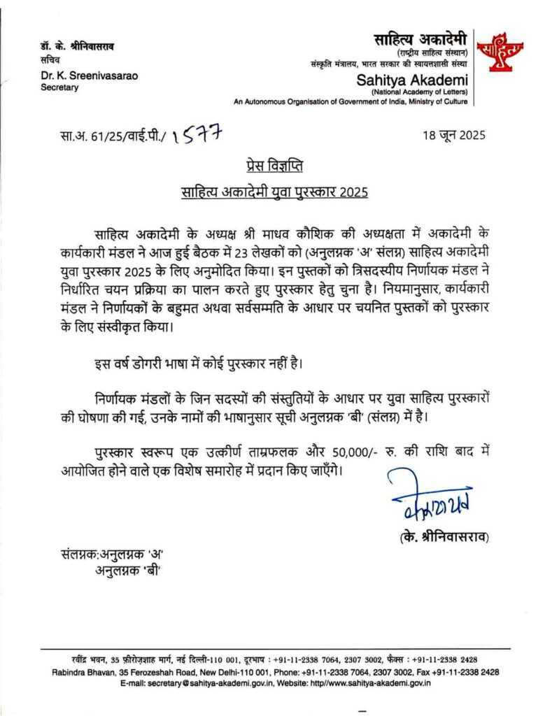 समाचार गढ़ | 18 जून, श्रीडूंगरगढ़। साहित्य और संस्कृति के क्षेत्र में श्रीडूंगरगढ़ ने एक ऐतिहासिक उपलब्धि हासिल की है। कस्बे के युवा लेखक पूनमचंद गोदारा को वर्ष 2025 के लिए पहली बार साहित्य अकादमी युवा पुरस्कार से सम्मानित किया जायेगा। यह प्रतिष्ठित पुरस्कार उन्हें राजस्थानी भाषा में रचित उनकी काव्य-पुस्तक ‘अंतस रै आंगणै’ के लिए प्रदान किया जाएगा। यह पहली बार है जब श्रीडूंगरगढ़ के किसी लेखक को केंद्रीय साहित्य अकादमी द्वारा यह राष्ट्रीय स्तर का सम्मान प्राप्त हुआ है, जिससे पूरे क्षेत्र में गौरव और उत्साह का माहौल है। साहित्य अकादमी के अध्यक्ष माधव कौशिक की अध्यक्षता में आज हुई बैठक में देशभर की 23 भाषाओ के लेखकों को युवा पुरस्कार के लिए चयनित किया गया, जिनमें पूनमचंद गोदारा का चयन राजस्थानी भाषा के अंतर्गत किया गया है। यह पुरस्कार आगामी आयोजित विशेष समारोह में प्रदान किया जाएगा। पुरस्कार के रूप में एक उत्कीर्ण ताम्रफलक और ₹50,000 की राशि प्रदान की जाएगी। यह सम्मान न केवल पूनमचंद गोदारा की साहित्यिक साधना को राष्ट्रीय मंच पर पहचान दिलाता है, बल्कि श्रीडूंगरगढ़ की धरती की साहित्यिक गरिमा को भी ऊँचाइयों तक ले जाता है। उनकी यह उपलब्धि क्षेत्र के युवाओं और नवोदित लेखकों के लिए प्रेरणा का स्त्रोत बन रही है। बता दें कि यह युवा पुरस्कार पहली बार पूनम चंद गोदारा को दिया जा रहा है इससे पहले भी अकादमी द्वारा साहित्यकार डॉक्टर चेतन स्वामी, मदन सैनी व रवि पुरोहित को अन्य पुरस्कार दिए जा चुके हैं।