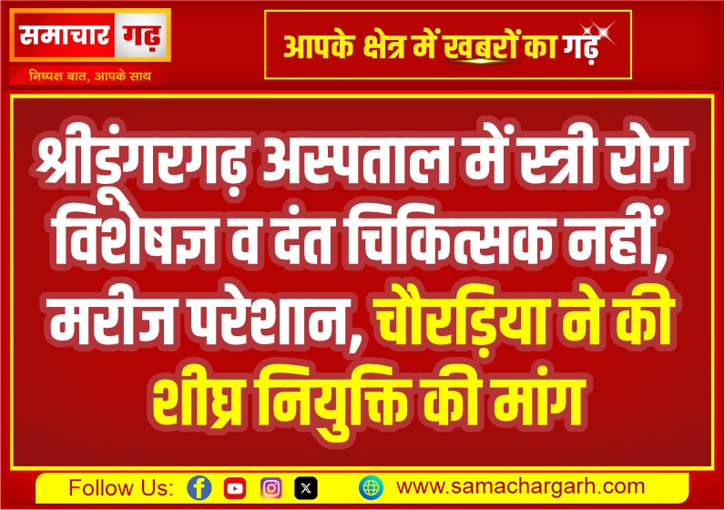 समाचार गढ़, 13 अक्टूबर श्रीडूंगरगढ़। श्रीडूंगरगढ़ के राजकीय उप जिला चिकित्सालय में लंबे समय से स्त्री रोग विशेषज्ञ व दंत चिकित्सक के पद रिक्त चल रहे हैं, जिससे आमजन को भारी परेशानी का सामना करना पड़ रहा है। क्षेत्र की जनता की इस गंभीर समस्या को लेकर वरिष्ठ कांग्रेसी नेता तुलसीराम चौरड़िया ने मुख्य चिकित्सा एवं स्वास्थ्य अधिकारी बीकानेर को पत्र लिखकर शीघ्र नियुक्ति की मांग की है।