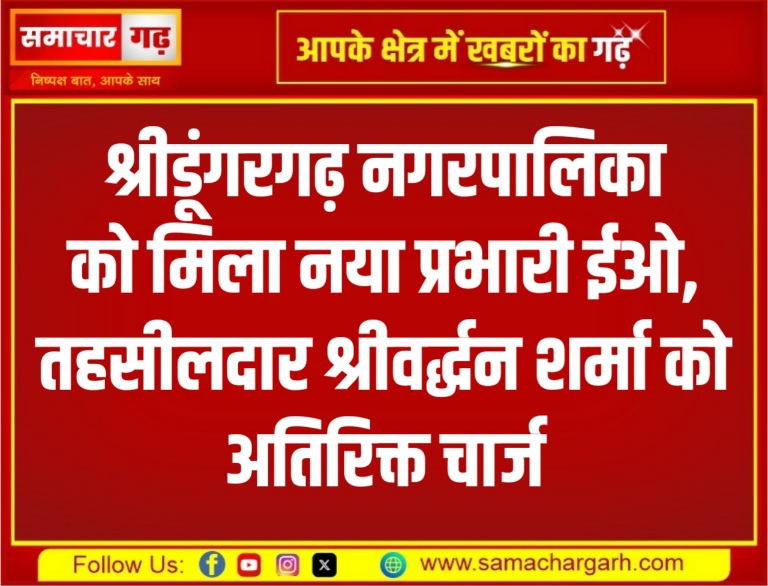 श्रीडूंगरगढ़ से बड़ी प्रशासनिक खबर सामने आई है। तहसीलदार श्रीवर्द्धन शर्मा को नगरपालिका श्रीडूंगरगढ़ का अधिशासी अधिकारी (ईओ) का अतिरिक्त प्रभार सौंपा गया है।