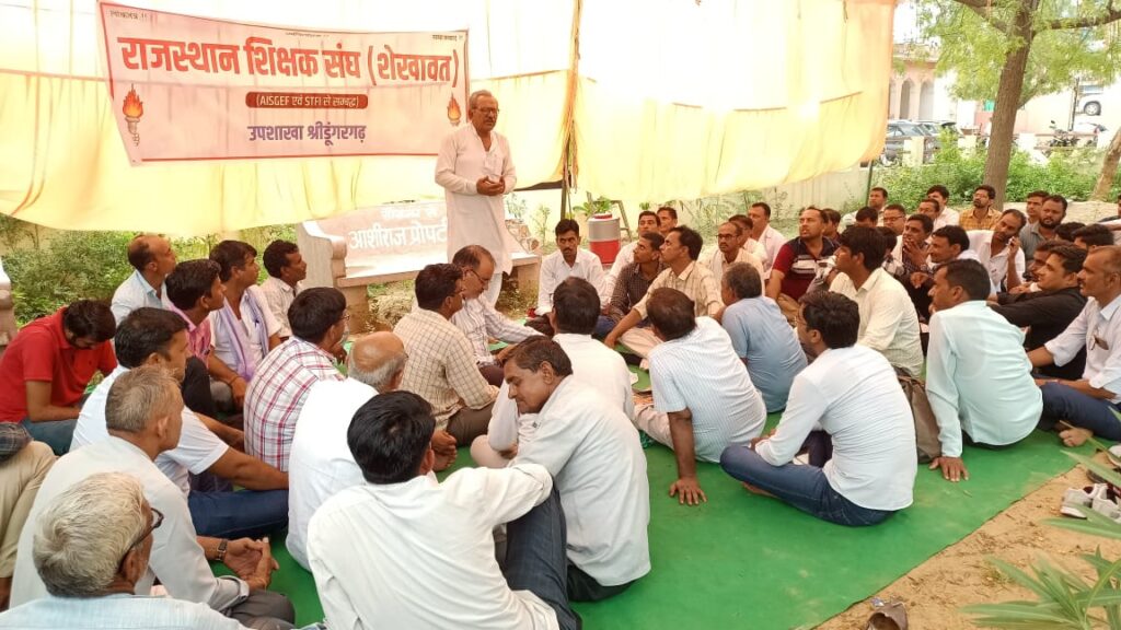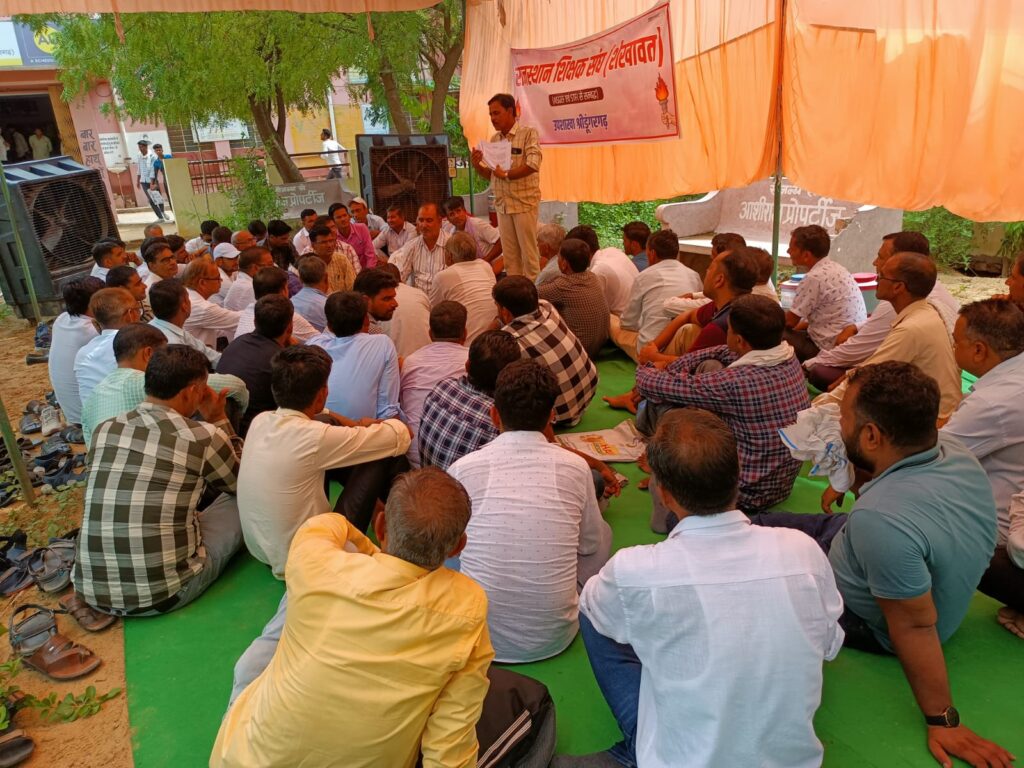 समाचार-गढ़, श्रीडूंगरगढ़। राजस्थान शिक्षक संघ शेखावत श्रीडूंगरगढ़ ने उपखंड अधिकारी कार्यालय के आगे आज धरना दिया और संकल्प पत्र सोंपा गया। उनकी मुख्य मांग है कि बीएलओ जैसे गैर शेक्षणिक कार्य से शिक्षको को मुक्त किया जाये। वरिष्ठ शिक्षक नेता सोहन गोदारा ने कहा कि शिक्षा को बचाने के लिये शिक्षकों को ही आगे आना होगा। सरकार निजीकरण करने पर तुली हुई है भारत सरकार की नयी शिक्षा नीति भी निजीकरण का पुलिंदा है। सार्वजनिक संस्थान को पूंजीपतियों के हाथों बेच रही है, साल भर चलने वाले बीएलओ का कार्य स्कूल को व गरीब को बर्बाद कर रहे है। संविधान में कानून का प्रावधान होने के बाद भी अधिकारी जबरदस्ती कानून की धज्जियां उडा रहे हैं। जिला अध्यक्ष आदुराम मेघवाल ने कहा कि प्रशाशन कुछ भी करले अब शिक्षक बीएलओ का कार्य नहीं करेंगे। एसडीएम द्वारा सकारात्मक पहल नहीं की जा रही है अब आंदोलन को ओर तेज किया जायेगा पूरे जिले से उपखण्ड अधिकारी को ज्ञापन दिया जायेगा, तहसील अध्यक्ष हरिराम सहू ने कहा तहसील के हर अध्यापक वर्षभर विद्यालय जायेंगे। सभी को साथ लेकर आंदोलन करेंगे। हर उस कार्य का बहिष्कार करेंगे जो बेगार रूप में 34 प्रकार के कार्य है जो नहीं करेंगे। किसी शिक्षक साथी के साथ अन्याय नहीं होने दिया जायेगा। शिक्षक नेता प्रभु राम बाना, कुशलाराम सहू, दाना राम डेलू सभा अध्यक्ष बाला राम मेघवाल, कैलाश सिहाग, पन्ना राम डेलू, श्रवण सारस्वत, लालचंद गोदारा, मुकेश मीणा आदि ने सम्बोधित किया तथा बहिष्कार करने का संकल्प लिया।