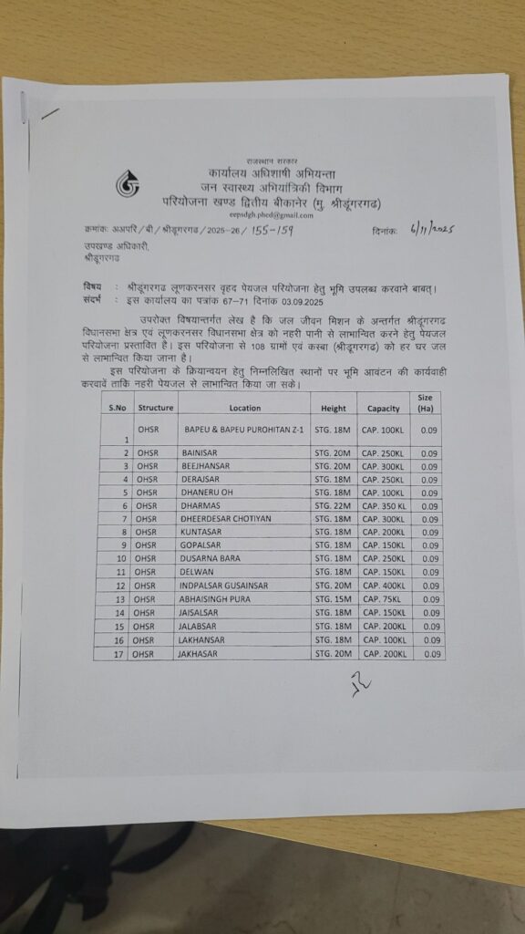 श्रीडूंगरगढ़ में ‘हर घर जल’ का सपना साकार, 108 गांवों व शहरी क्षेत्र के लिए 663 करोड़ की ऐतिहासिक पेयजल परियोजना का वर्क ऑर्डर जारी