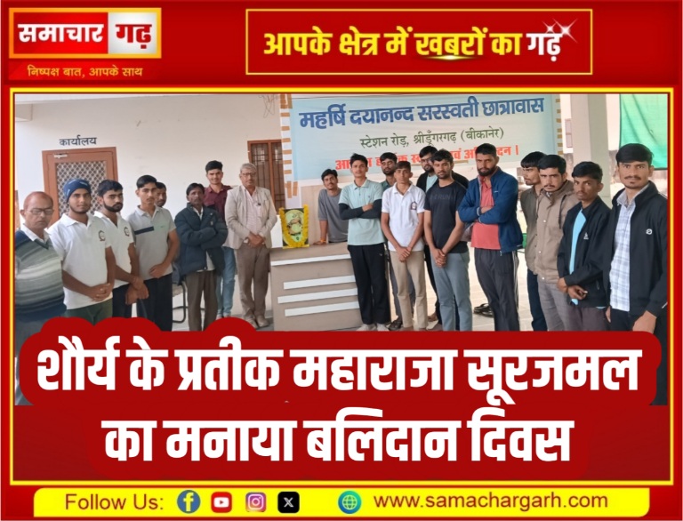 समाचार गढ़, श्रीडूंगरगढ़। महर्षि दयानंद सरस्वती छात्रावास में गुरुवार को महाराजा सूरजमल के 262 वें बलिदान दिवस पर श्रंद्धाजलि सभा का आयोजन रखा गया । दो मिनट का मौन एवं पुष्पांजलि अर्पित कर अजेय वीर योद्धा महाराजा सूरजमल को श्रंद्धाजलि दी गयी । कर्मचारी नेता सुशील सेरडिया ने कहा कि शौर्य के प्रतीक महाराजा सूरजमल एक महान अजेय योद्धा थे, उनमें वीरता, धीरता, उदारता, दूरदर्शिता का संगम सुशोभित था । समावेशी सोच को आत्मसात करने वाली भारतीयता के सच्चे प्रतीक थे । मुकेश गोदारा ने कहा कि महाराजा सूरजमल ने जनकल्याणकारी सोच के साथ मजबूत रियासत की नींव रखी । वे हम सबके आदर्श थे । कार्यक्रम में रामकिशन सारण, रामनिवास हरडु, श्रवण बाना, कन्हैयालाल गोदारा, रतनाराम गोदारा, महेंद्र गोदारा, मदनलाल, सुशील पूनियां, दशरथ जाखड़, रामस्वरूप सहू, राजेन्द्र, मनोज चोटिया, मंजीत महिया, किशनलाल, राजूराम जाखड़, रामस्वरूप सिहाग, हड़मानाराम ज्याणी, लालचंद सहू, रामकिशन, सुमित गोदारा, विनोद कुमार सहू, कैलाश आदि उपस्थित रहे। एम डी एस छात्रावास वार्डन दयानन्द बेनीवाल ने सभी का आभार प्रकट किया।