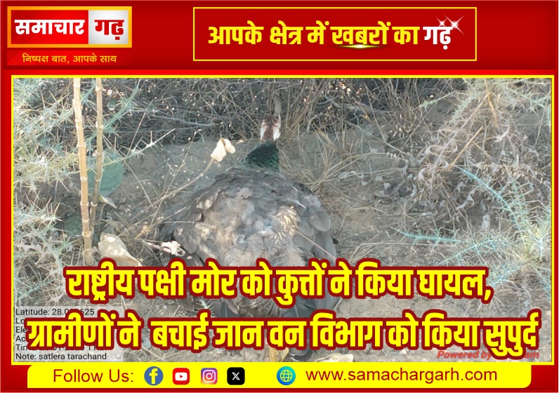 राष्ट्रीय पक्षी मोर को कुत्तों ने किया घायल, ग्रामीणों ने बचाई जान वन विभाग को किया सुपुर्द