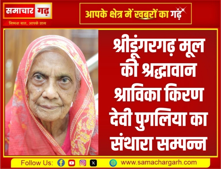 समाचार गढ़। श्रीडूंगरगढ़ निवासी एवं वर्तमान में साउथ कोलकाता प्रवासी, श्रद्धा की प्रतिमूर्ति श्राविका किरण देवी पुगलिया (उम्र 90 वर्ष), धर्मपत्नी स्व. धर्मचन्द्र जी पुगलिया का चौविहार संथारा शनिवार 3 जनवरी 2026 को दोपहर 12:45 बजे सम्पन्न हो गया।